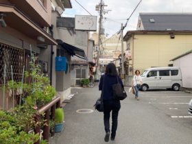 〒578-0974 東大阪市鴻池元町1−12付近。鴻池新田会所西側、運河沿いの道。左手にフードショップ森田屋、み…