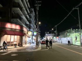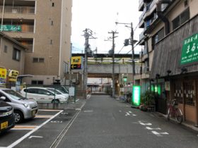〒577-0057 大阪府東大阪市足代新町6付近。ラインシネマ布施の西側道路を北から近鉄奈良線を見て撮影。右手に見…