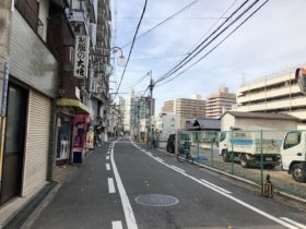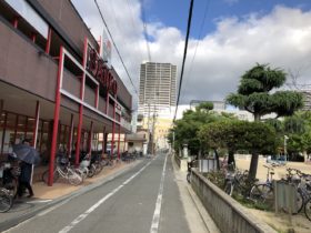 東大阪市小阪1-3付近から、北に向かって「メルシィ街」を撮影。目印は「制服の大垣」。道路の拡張工事が本格化しています。…