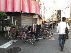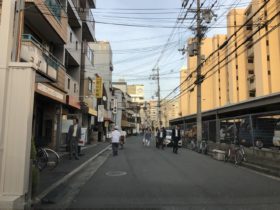 東大阪市下小阪5-5付近。八戸ノ里商店街の「美容室おおた」から西に向かって撮影。奥には「串かつちとせ」に並ぶ人々。