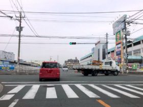 東大阪市菱江3-1付近から、菱江口中の交差点を東に向かって撮影。写真右手に見えるのは、ライフ、スポーツゼビオなどが入っ…