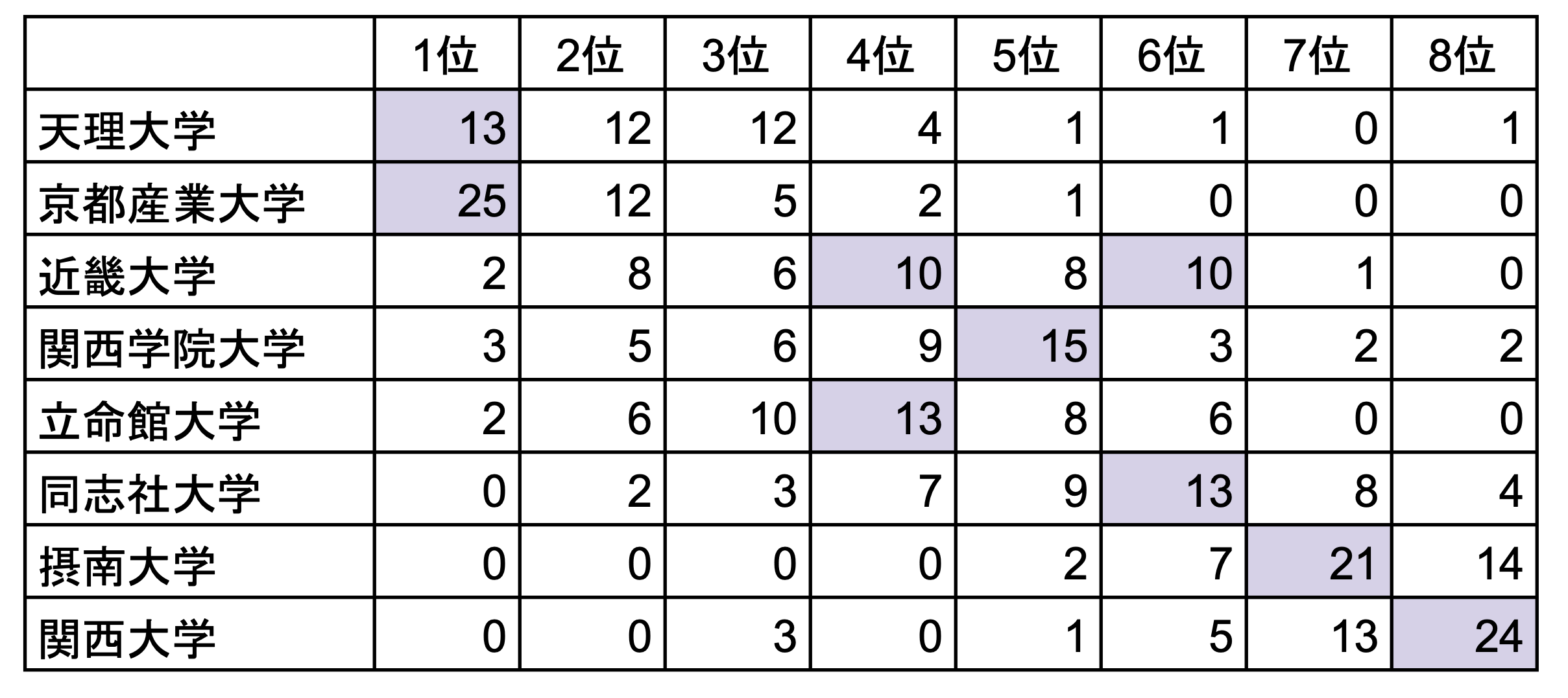 現在Aリーグに所属しているのは天理大学、京都産業大学、近畿大学、関西学院大学、立命館大学、同志社大学、摂南大学、関西大学の8校。上位3校は冬に行われる全国大学選手権に出場、下位2校はBリーグとの入れ替え戦に回ります。