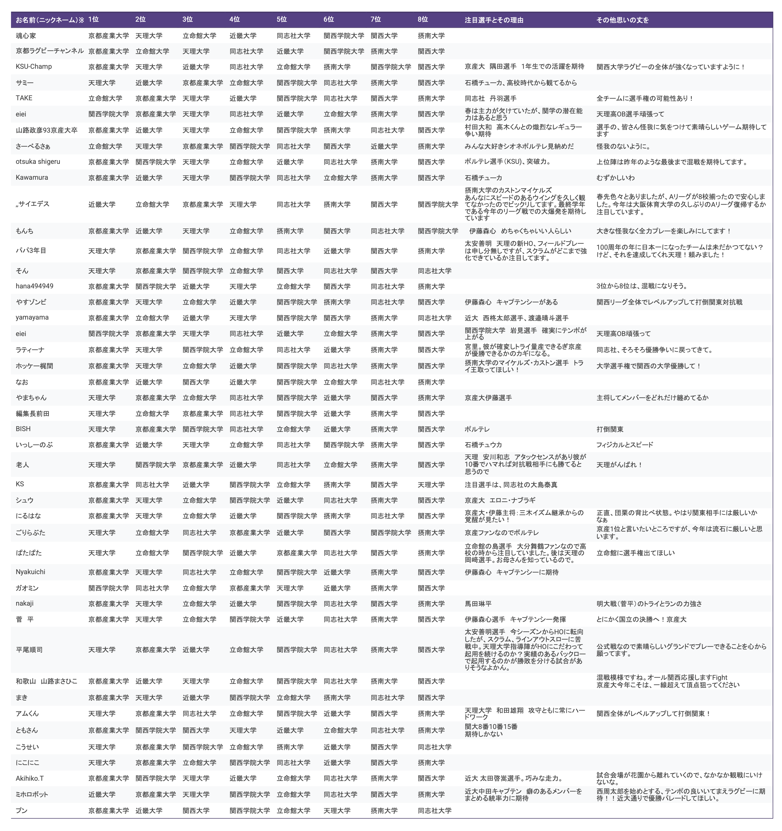 先日、読者の皆さんから募集した順位予想を集計したのはこちら。