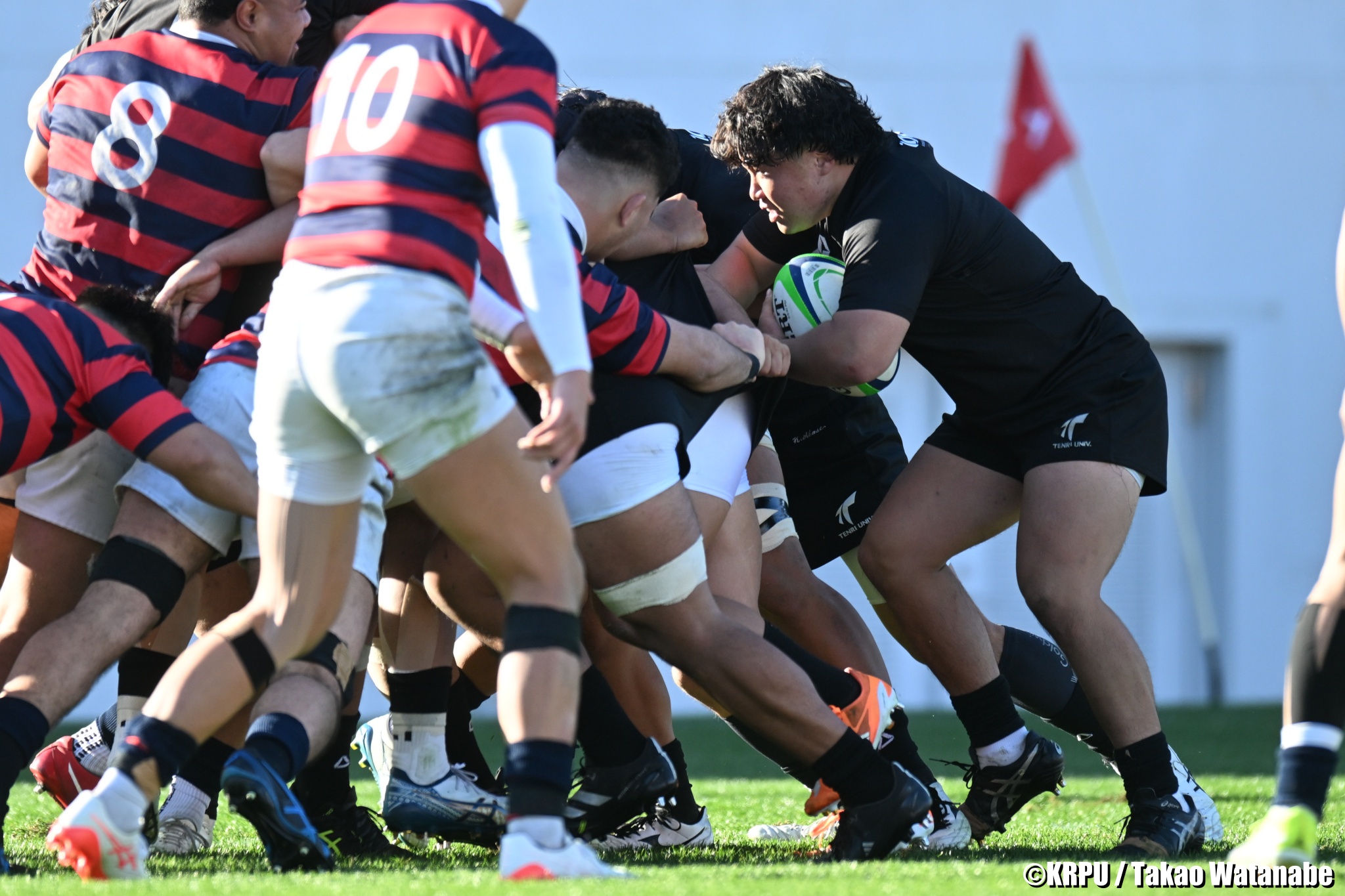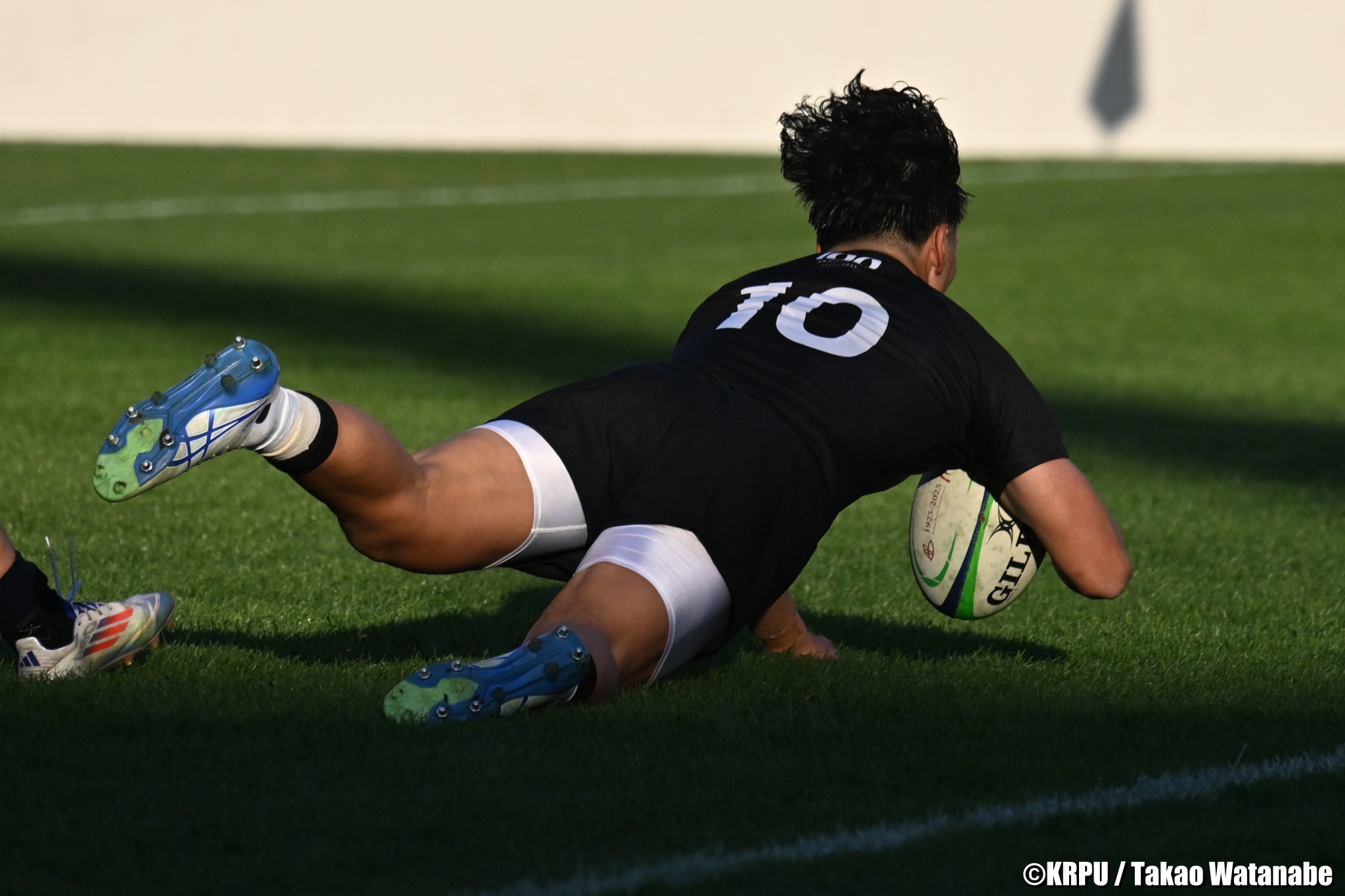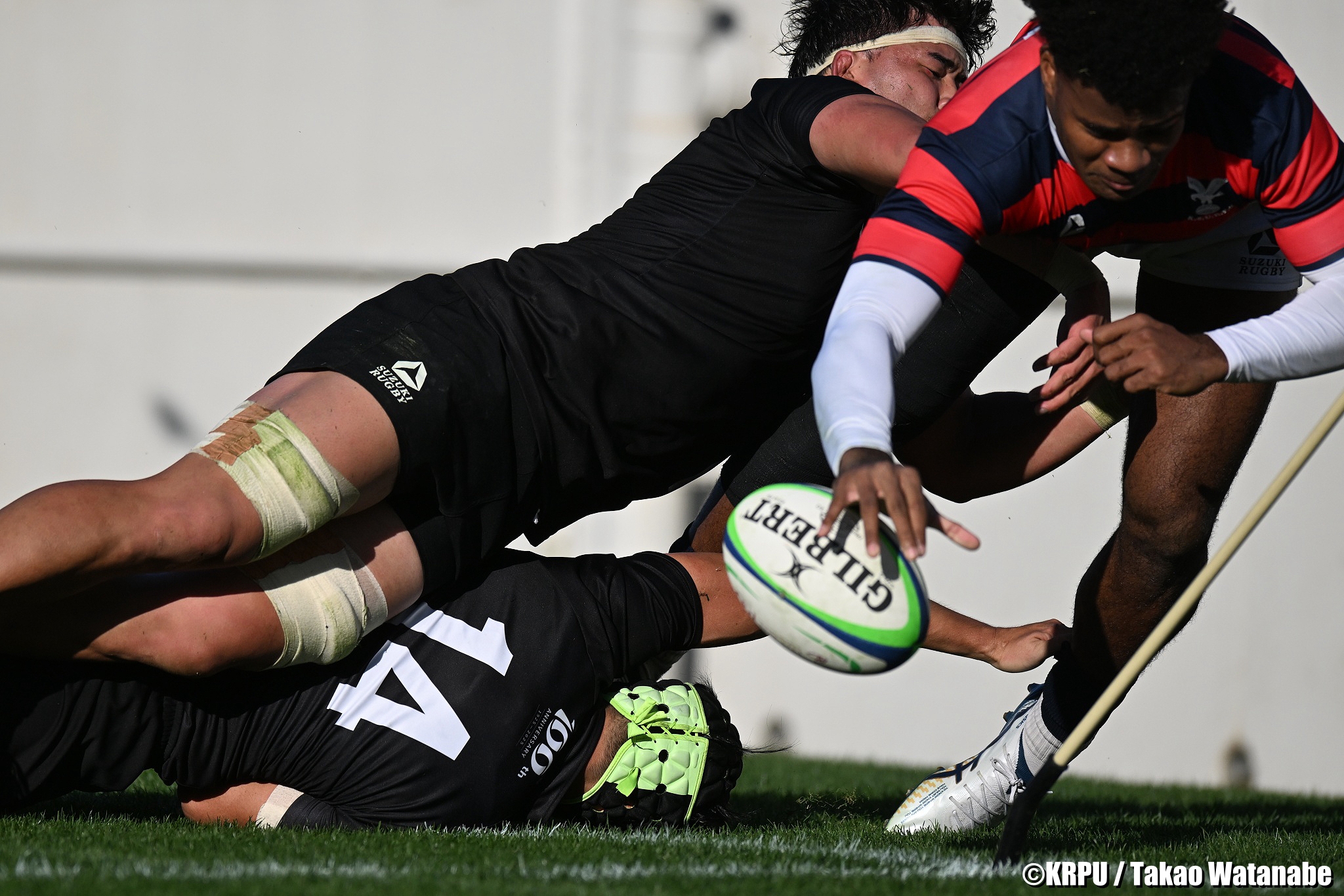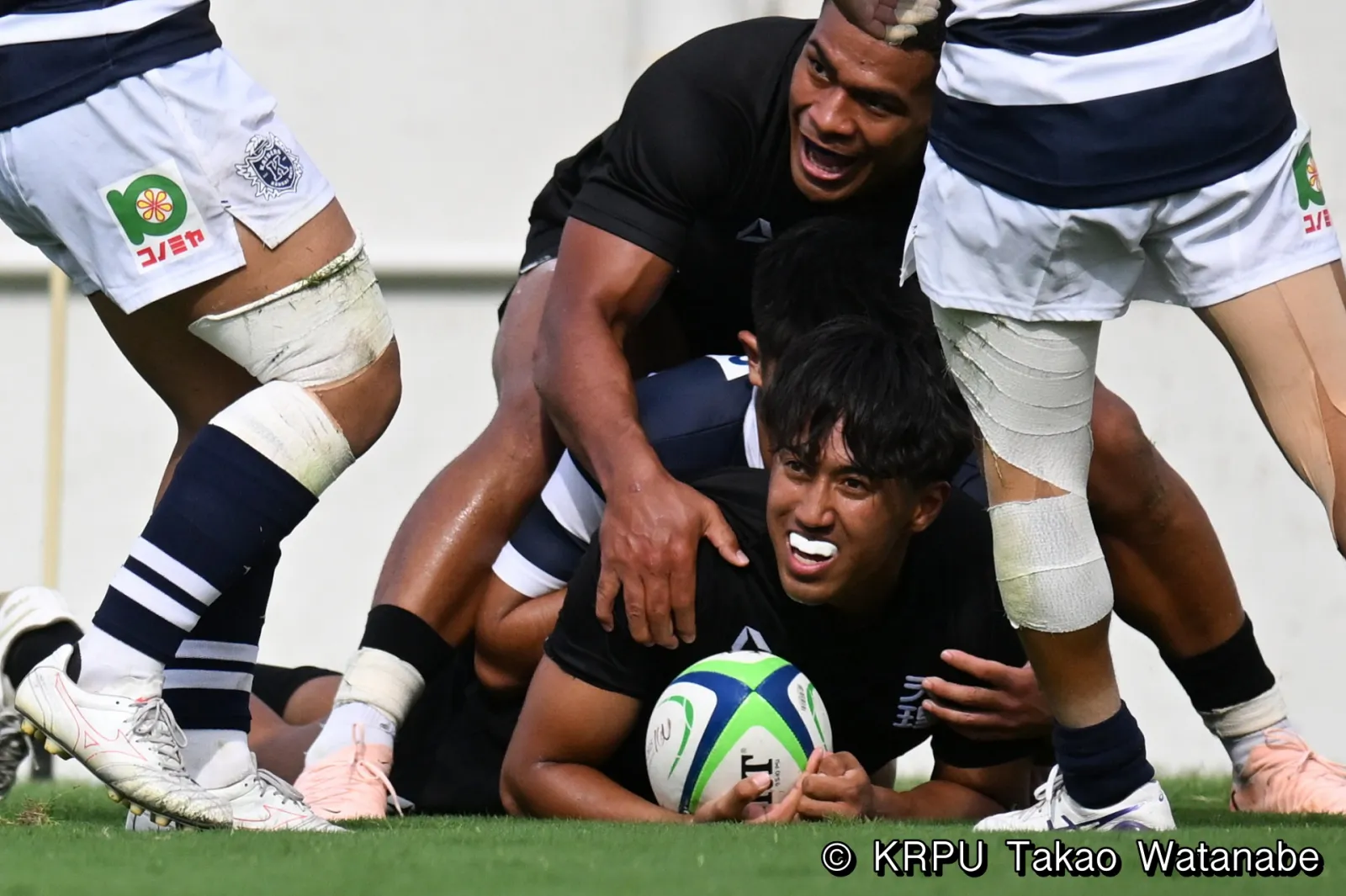 前半5分、連続攻撃からSH朝倉が抜け出して先制トライ。後半3分にはラインアウトからモールで押し込み、HO稲嶺がインゴールへ。