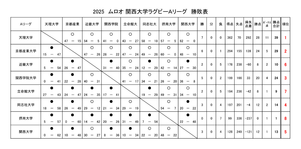 あんなに待ち遠しかった関西大学リーグ、もとい2025ムロオ関西大学ラグビーAリーグが11月30日東大阪市花園ラグビー場での4試合で全日程を終え、天理大学が7戦全勝。2年連続14回目の優勝を果たしました。
