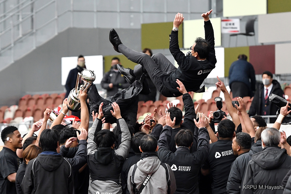 特にスクラムとラインアウト。最終節の京都産業大戦では前半からFWで圧倒し21−8とリードし、後半もモールからトライを奪うなど「前で勝つ」ラグビーをやりきりました。