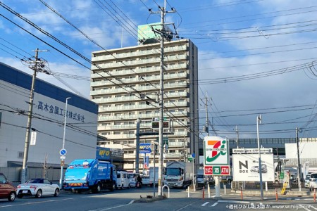 阪神高速の高架よりも遥かに高い。八尾枚方線沿い「セブンイレブン 東大阪菱江3丁目店」前から。