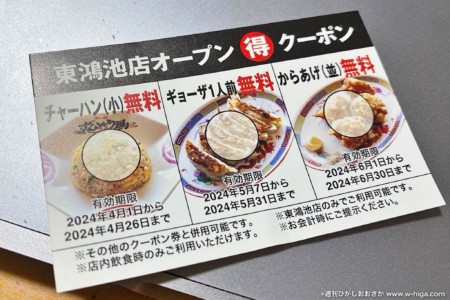 お会計の際、チャーハン(小)、餃子1人前、からあげ(並)無料のクーポンがもらえました。東鴻池店の先着5,000名がもらえるそうです。おそらくまだ配っているかと…。