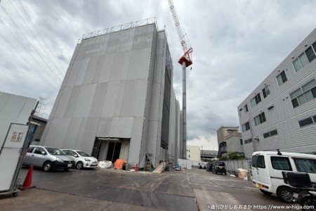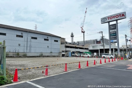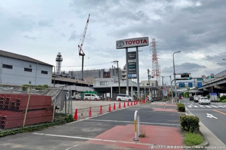 ここから北、トヨタのディーラー「大阪トヨペット」横にもマンションが建築中。こちらはすでに足場が組まれています。