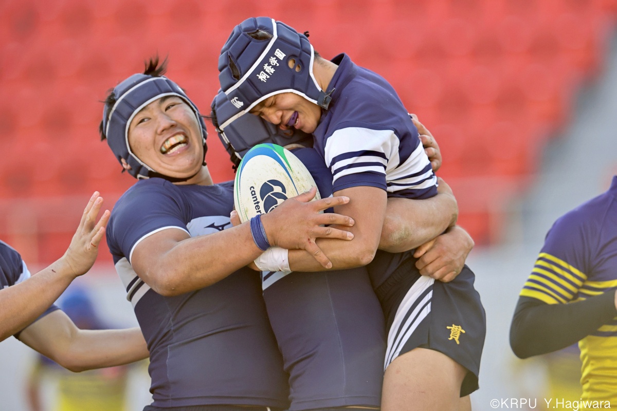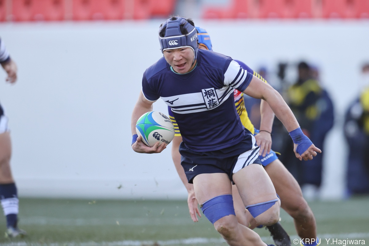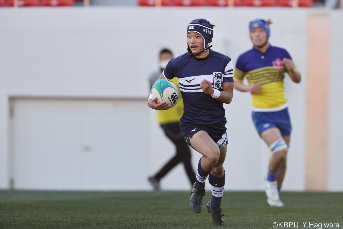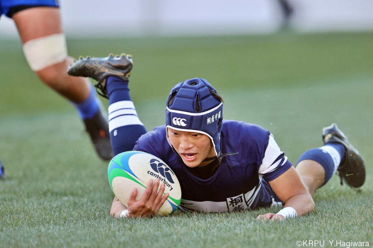 ここから勢いに乗る桐蔭学園は、FWでとったボールを外へと回す展開ラグビーに。相手よりも早く動き、試合のリズムを自分たちのものにする。