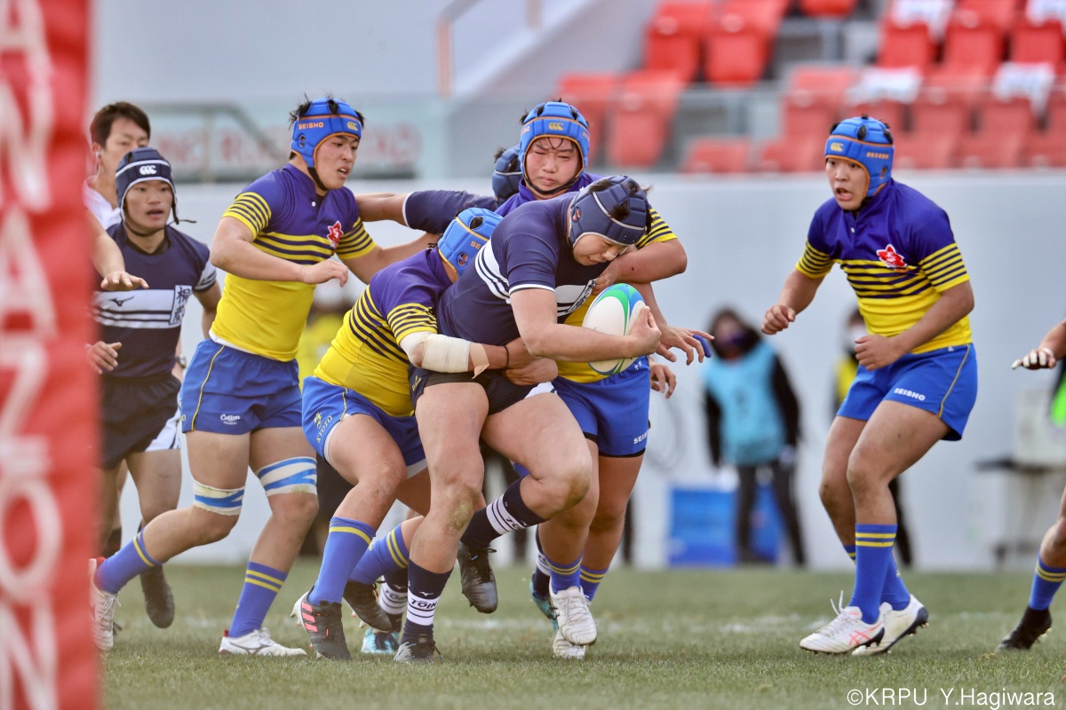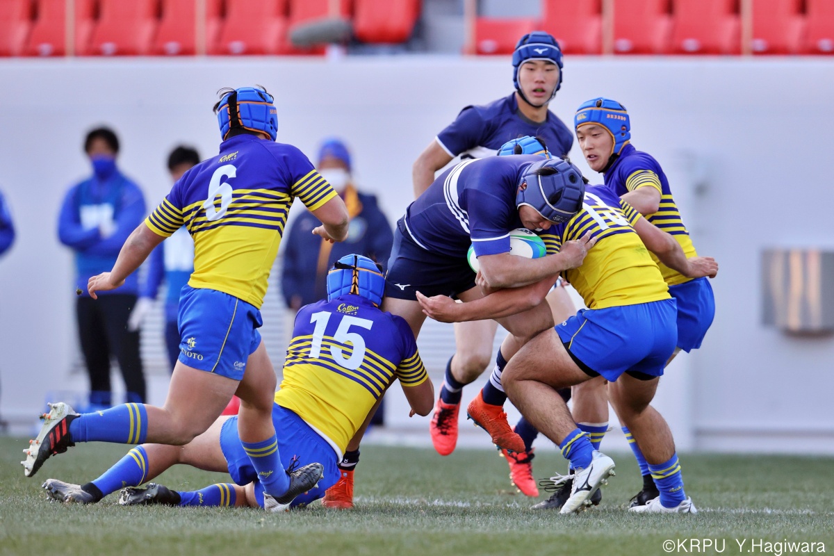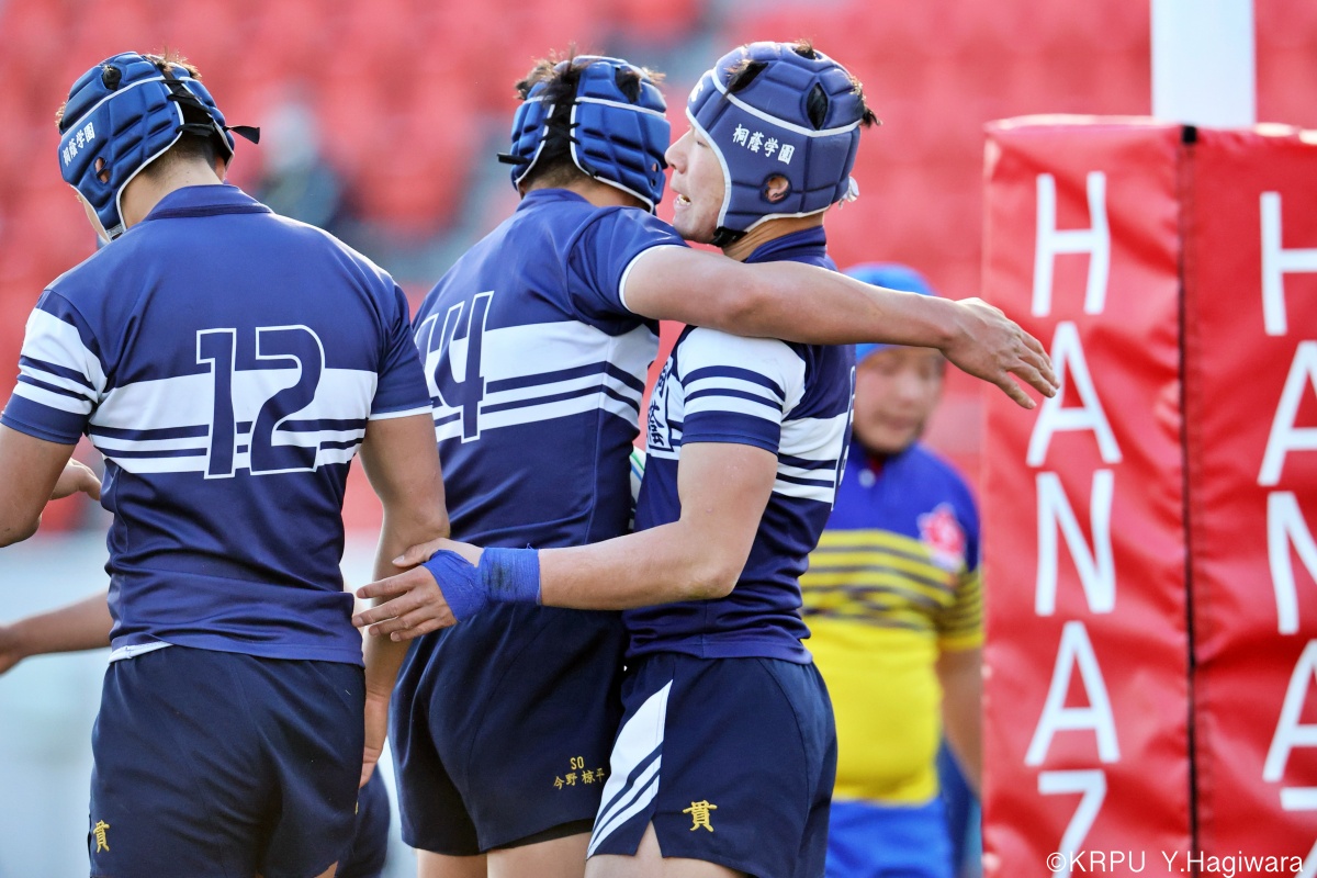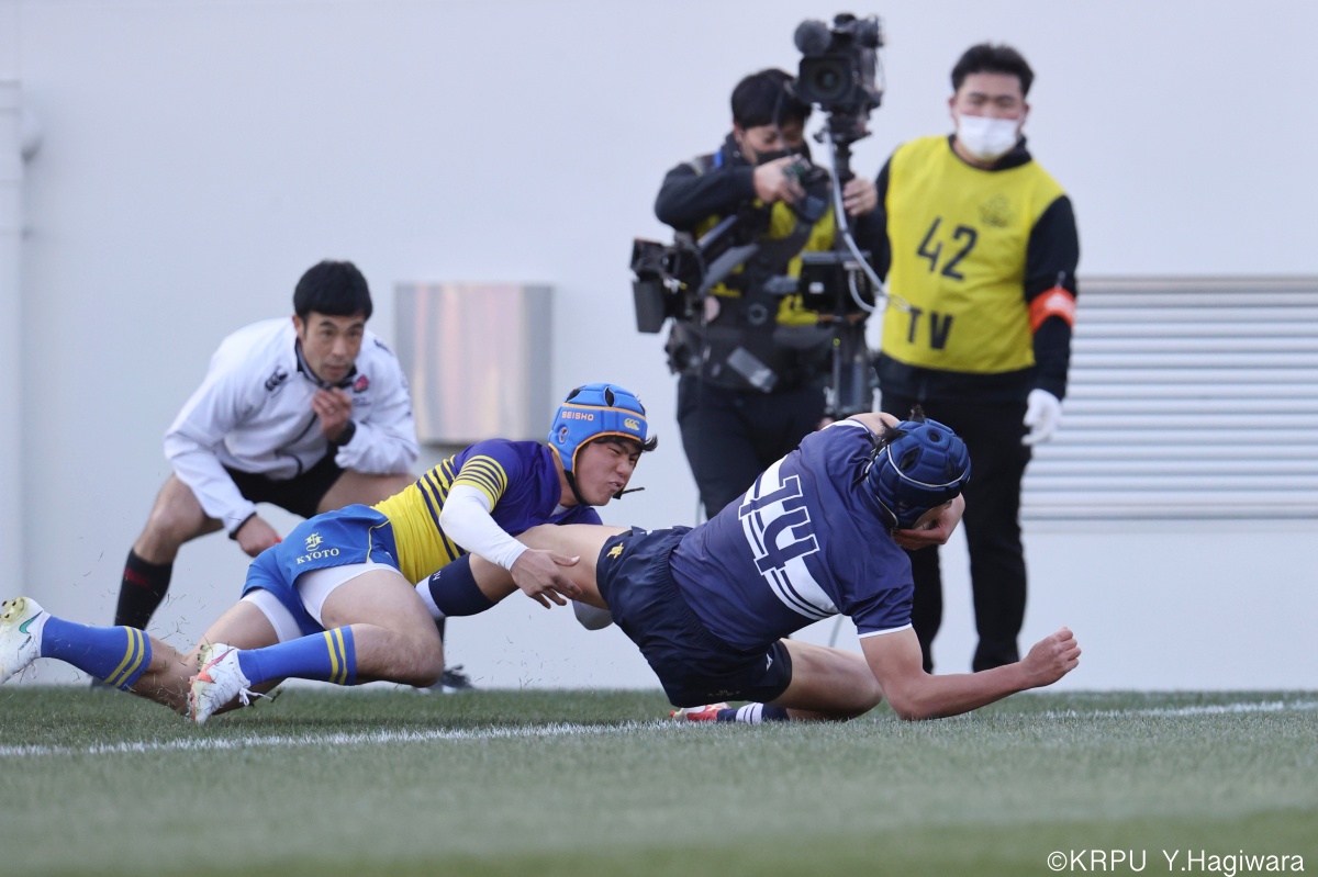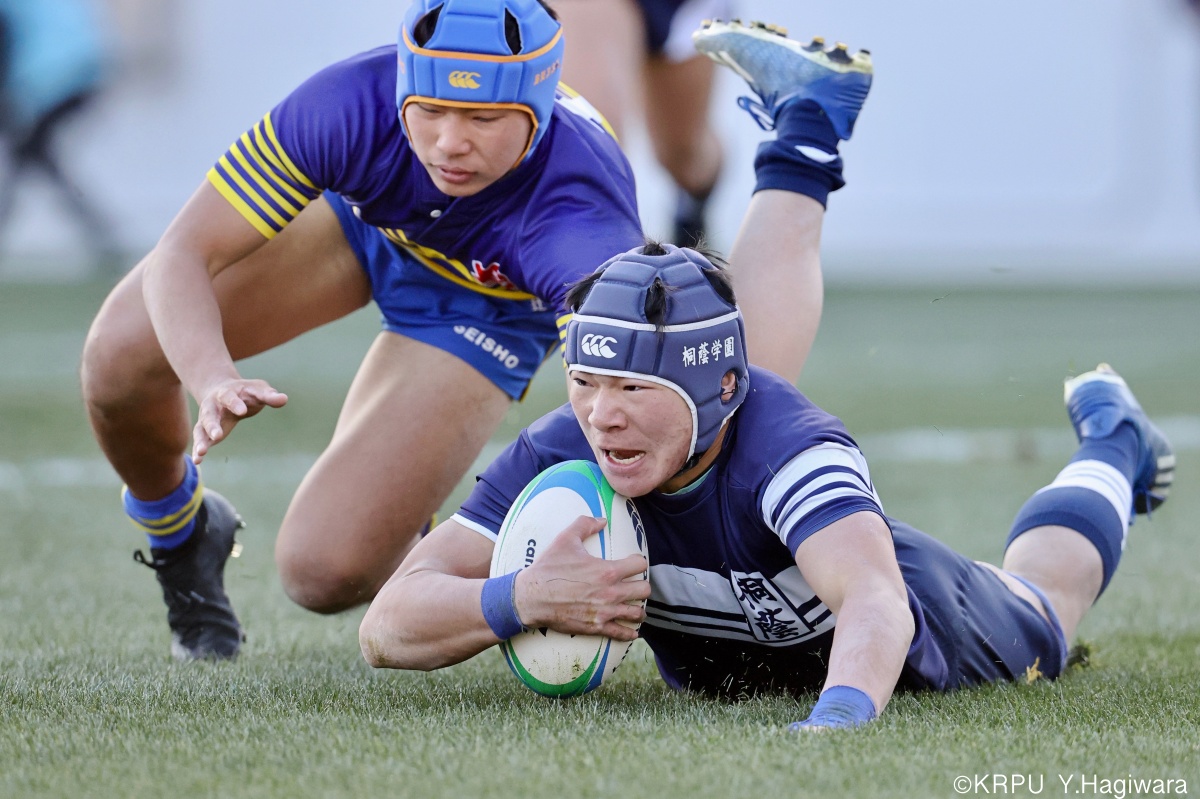 桐蔭学園は前半19分にラックから5青木が持ち出し先制トライするが、京都成章も負けじと取り返し、前半を互いに1T1G1PGの10-10で折り返す。