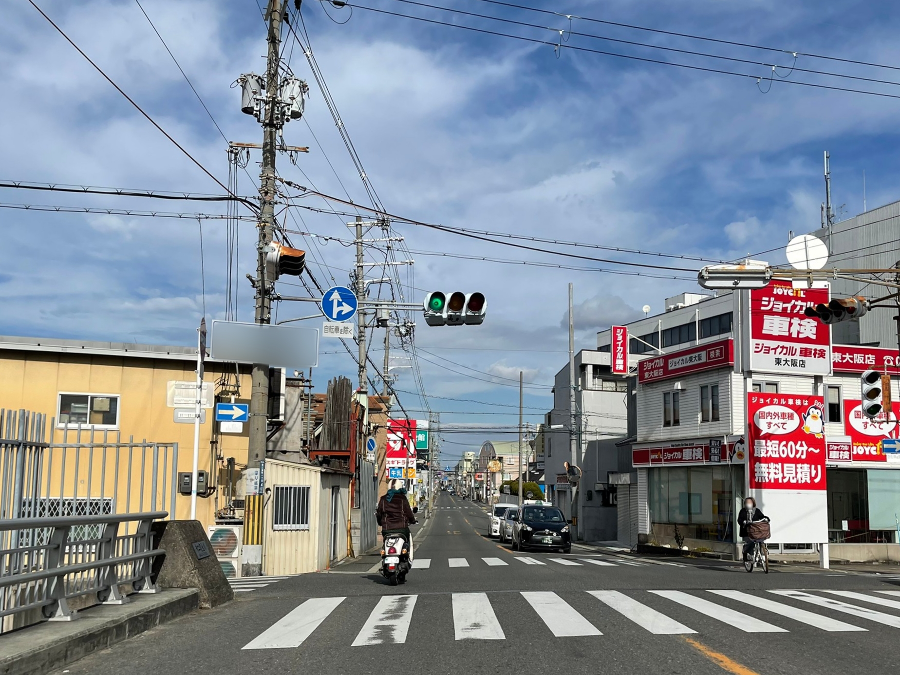 正解は、、、〒578-0943 大阪府東大阪市若江南町1-4付近、第二寝屋川に架かる八幸橋から八尾枚方線を北に向かって撮影しました。橋の中央が市境になっていて、以南は八尾市。