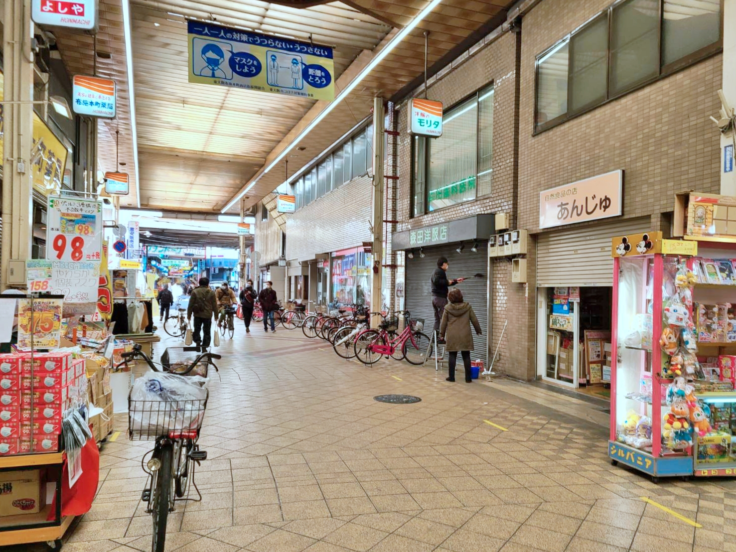 正解は、、、〒577-0841 大阪府東大阪市足代1-11付近、府道159号線・フラワーロードほんまちを「おもちゃ館カツラヤ」前から北に向かって撮影。北へ行くと近鉄奈良線の高架を越えて、ブランドーリ布施へ。