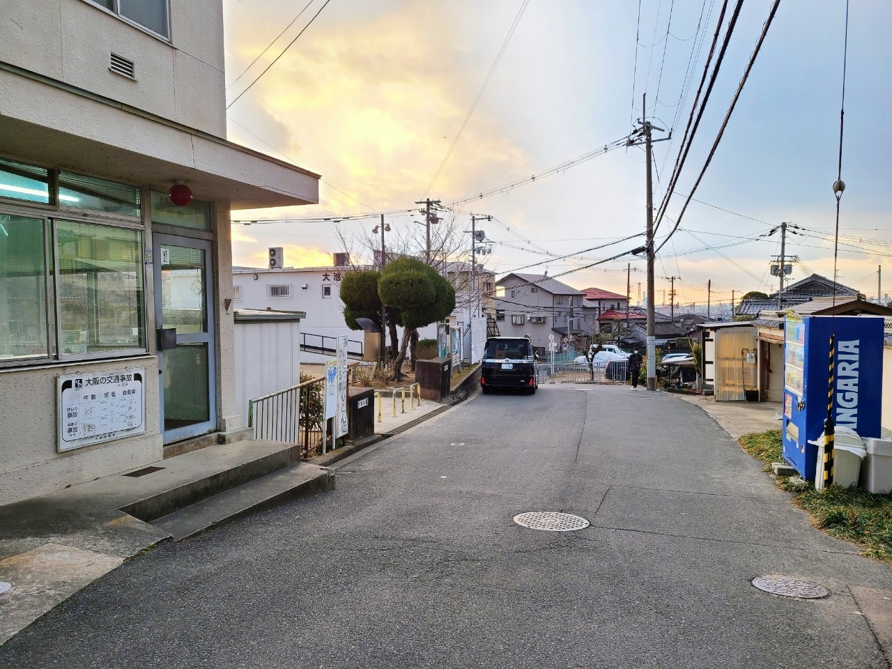 正解は、、、〒579-8052 大阪府東大阪市上四条町10−3付近を西に向かって。左手の四条町交番と大池公園がヒントに。公園の西には太鼓台が収納されている大池会館があります。