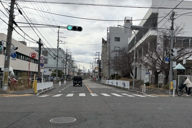 慢性的に渋滞する八尾街道を避けて抜け道にしている人も多いかも。このまま進むと左手に「クッチーナモモカ」が見えます。もちろんこのまま直進で近鉄長瀬駅。次の交差点を右折すると八尾街道やJR長瀬駅へと接続します。