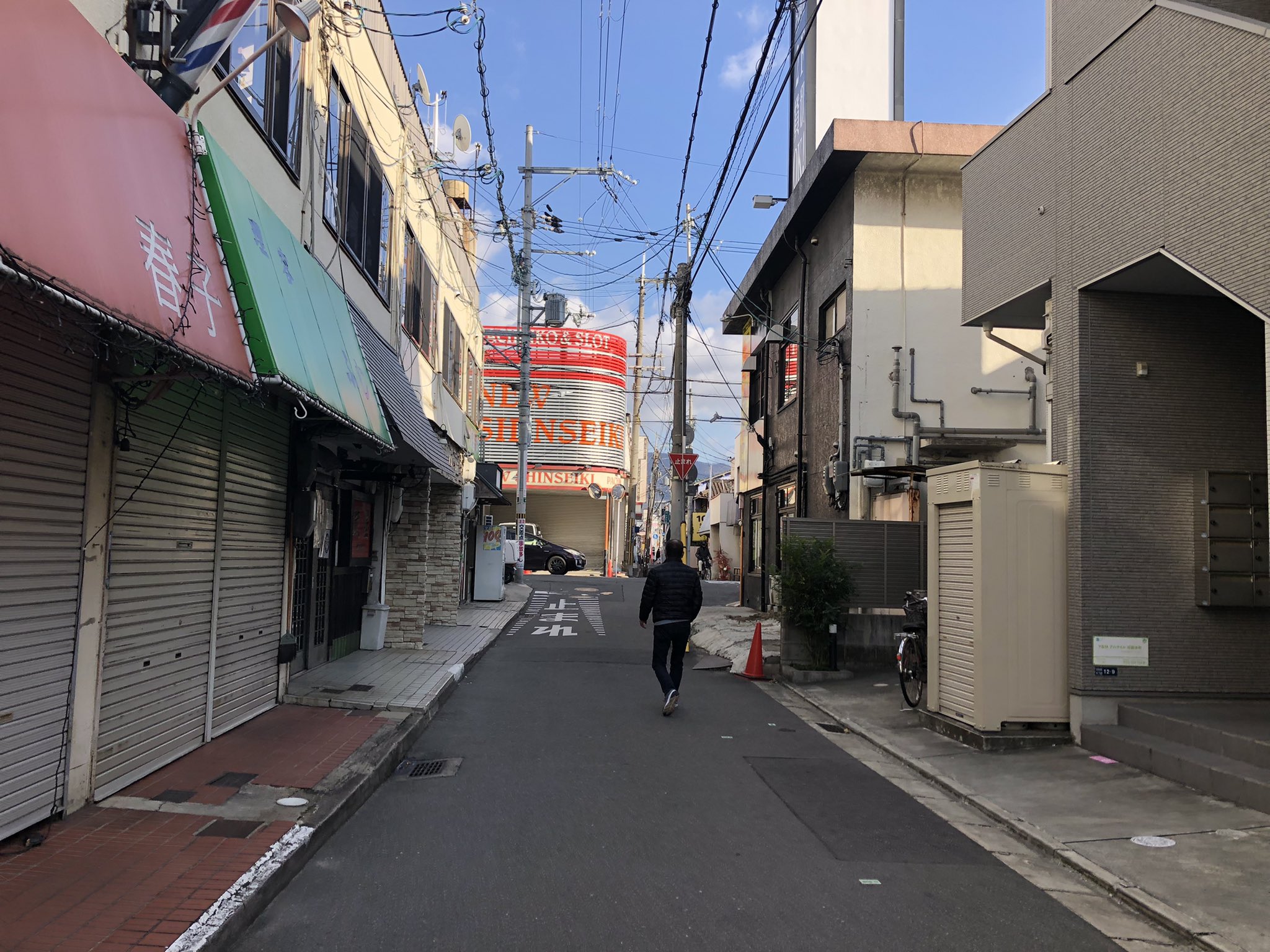 正解は、、、〒578-0937 大阪府東大阪市花園本町1-12付近を東に向かって撮影しました。近鉄河内花園駅の南西、正面奥に写っているのは「パチンコ&スロットニュー新世紀」です。まっすぐ東へ行くと、東方向に一方通行の下り坂、花園本町商店街が。交通事故に注意しながら進みましょう。