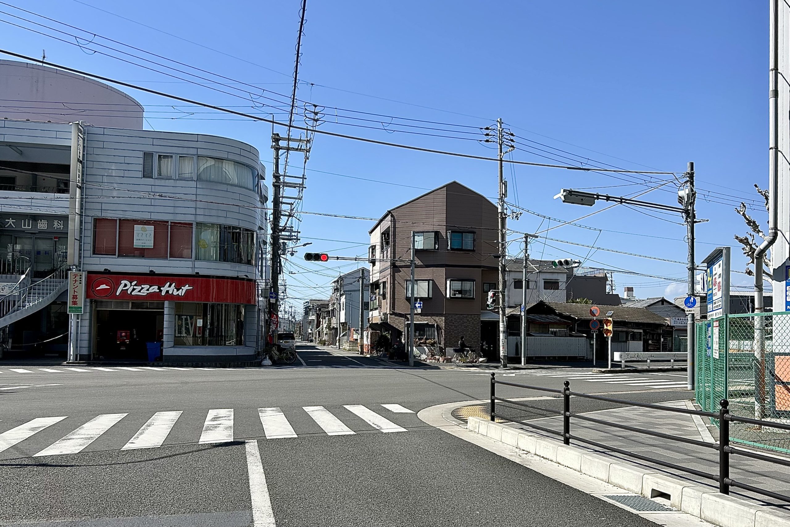 〒577-0843 大阪府東大阪市荒川2-48付近、近鉄大阪線の高架下。近鉄俊徳道駅を左手に、西に向かって撮影しました。正面に見えるのはピザハット俊徳道駅前店。右折して線路沿いを北西に進むと、布施駅。