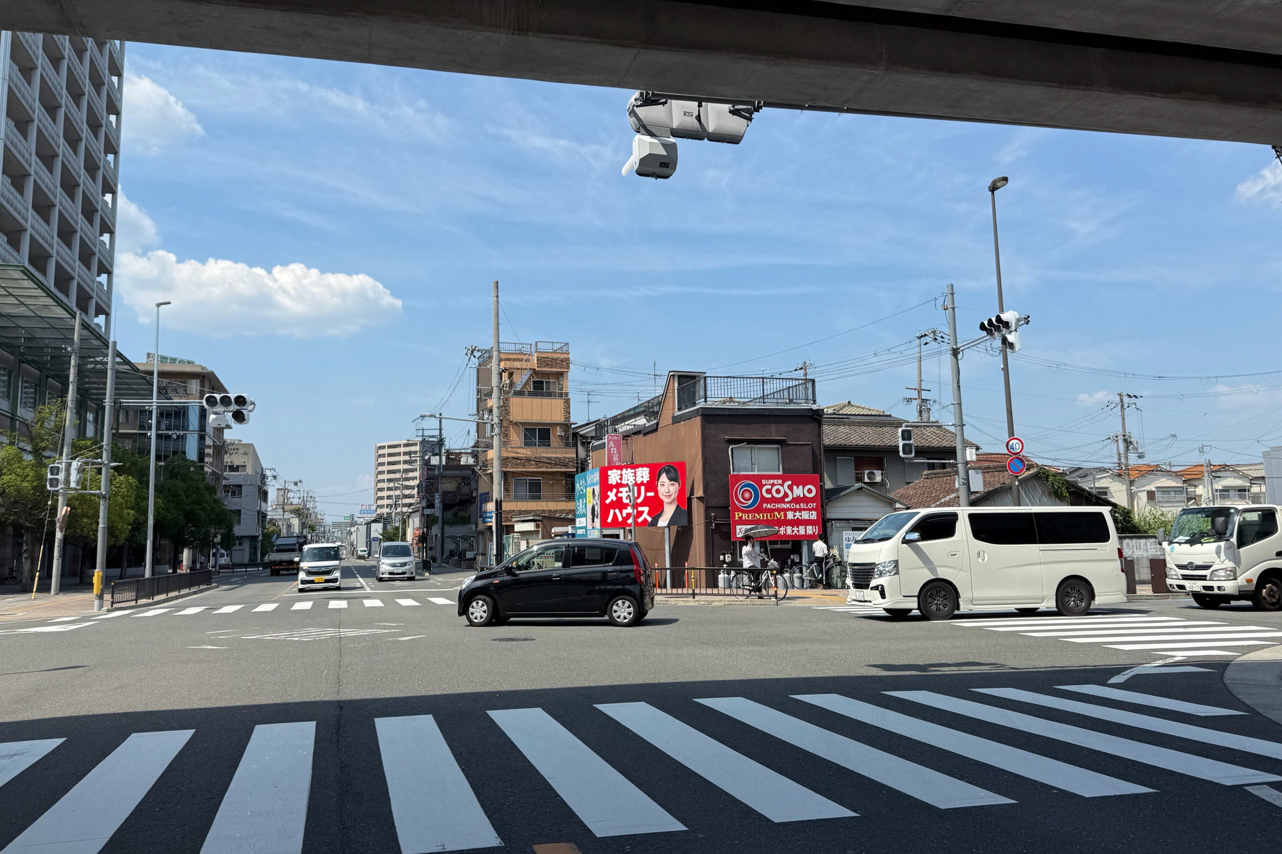 正解は、、、〒578-0941 大阪府東大阪市岩田町3-1付近を府道21号線(八尾枚方線)から北へ向かって撮影しました。信号を左折すると若江岩田駅、右折すると花園方面です。左前方は複合施設「希来里」。東大阪市内で2番目に高い建物です。では1番高い建物は…?