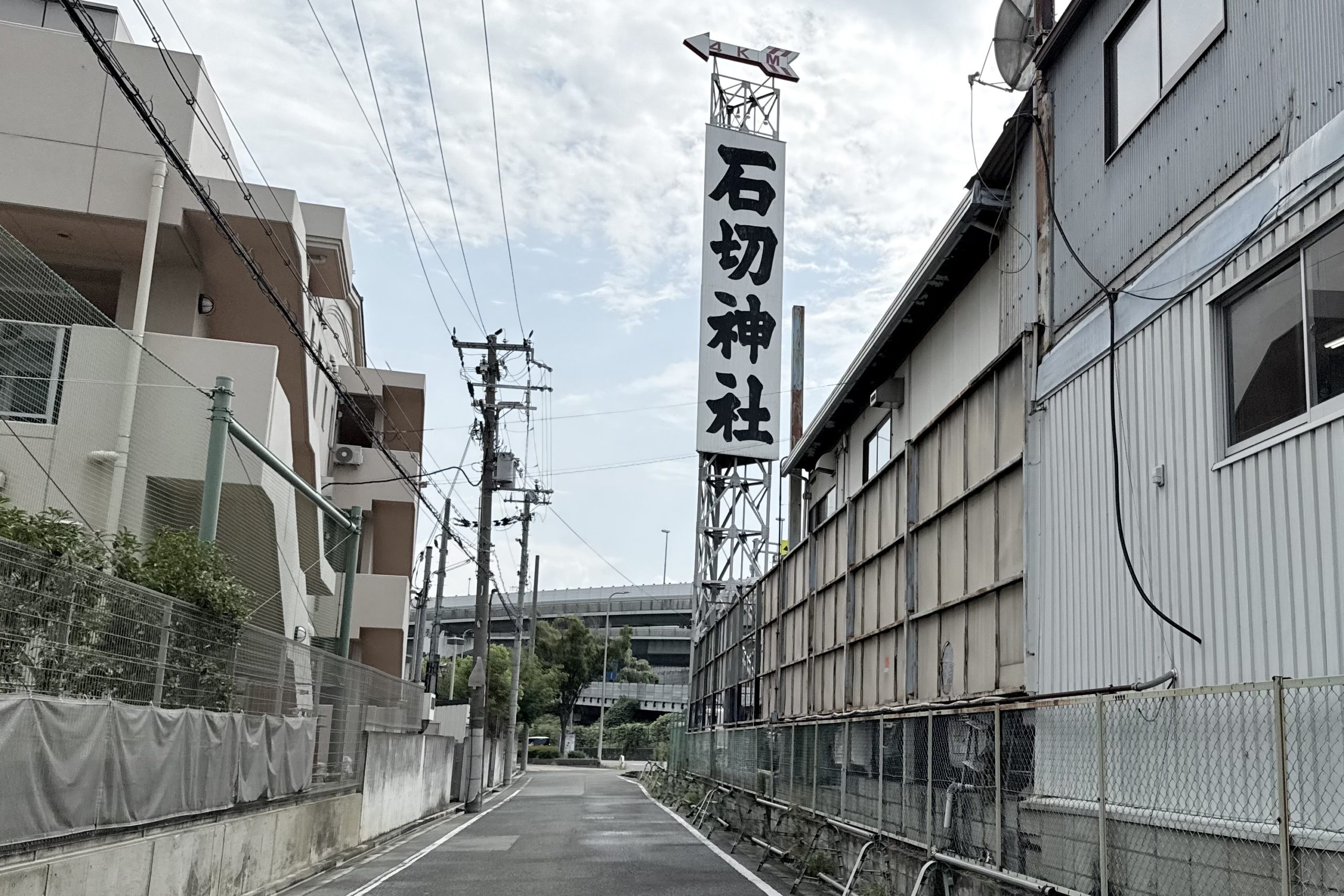 正解は、、、〒577-0011 大阪府東大阪市荒本北1-6付近。大阪府営東大阪春宮住宅の西側、はるみやこども園の裏側を中央環状線に向かって(南西)走行中です。前方に見えるのは東大阪ジャクソン。石切神社の看板に、感覚を狂わされがちになります。