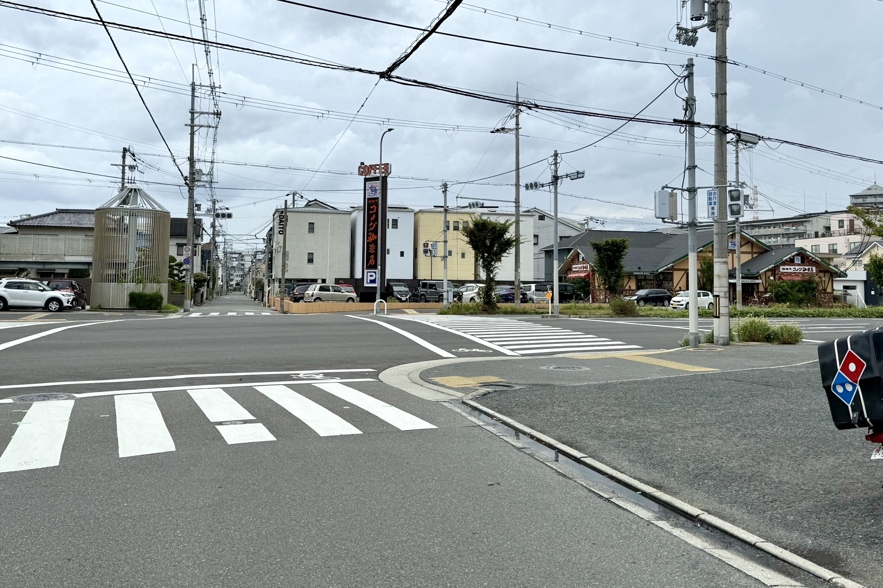 正解は、、、〒578-0982 大阪府東大阪市吉田本町3-1付近から西へ向かって撮影しました。右手側に「ドミノ・ピザ東大阪吉田店」。配達用のバイクが写っています。正面右には「コメダ珈琲店 東大阪吉田店」が。交差点を右折すると吉田駅方面、左折すると花園ラグビー場方面です。