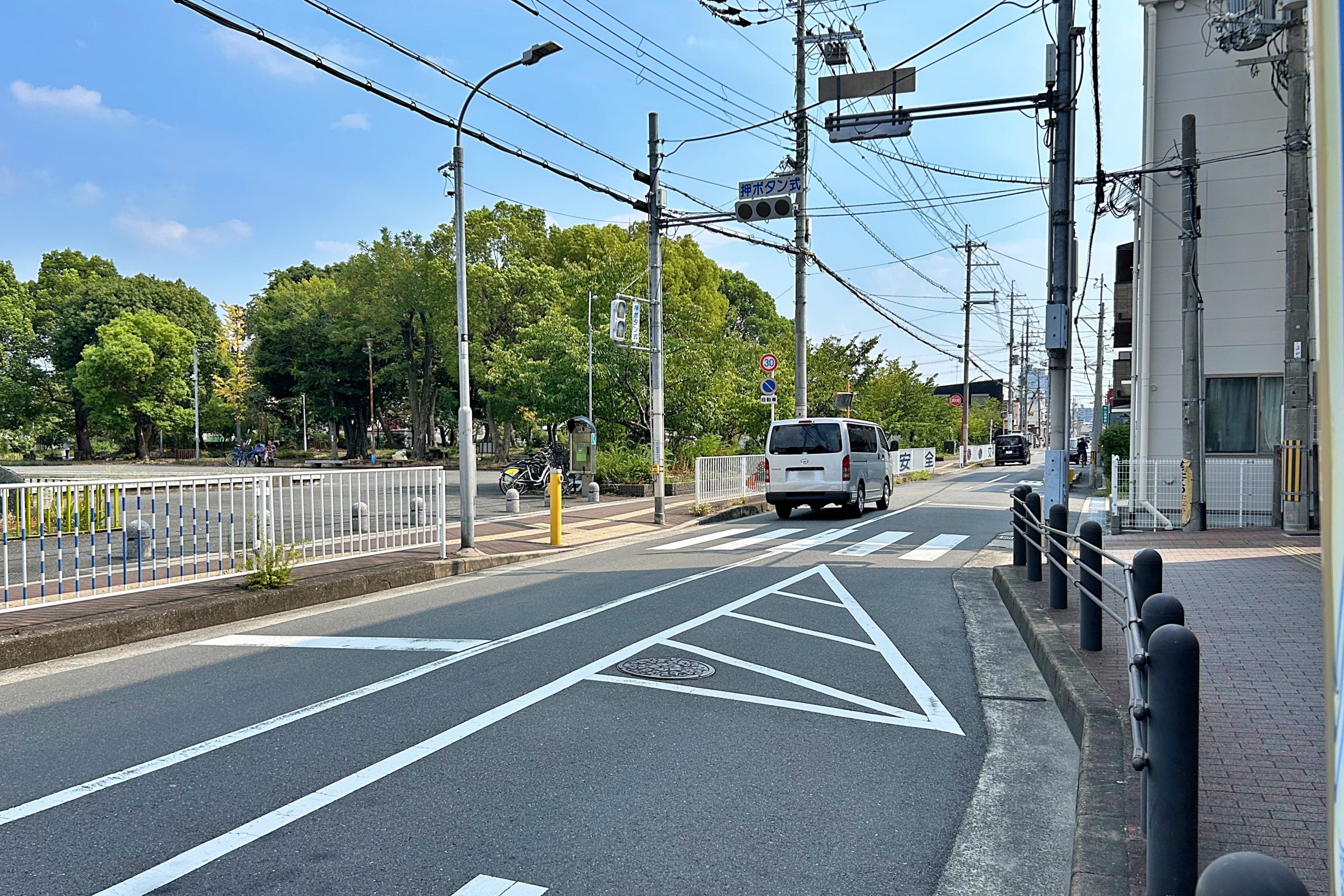 正解は、、、〒578-0975 大阪府東大阪市中鴻池町2-3付近、「中鴻池リージョンセンター」前から南に向かって撮影しました。左手は寺嶋公園です。
