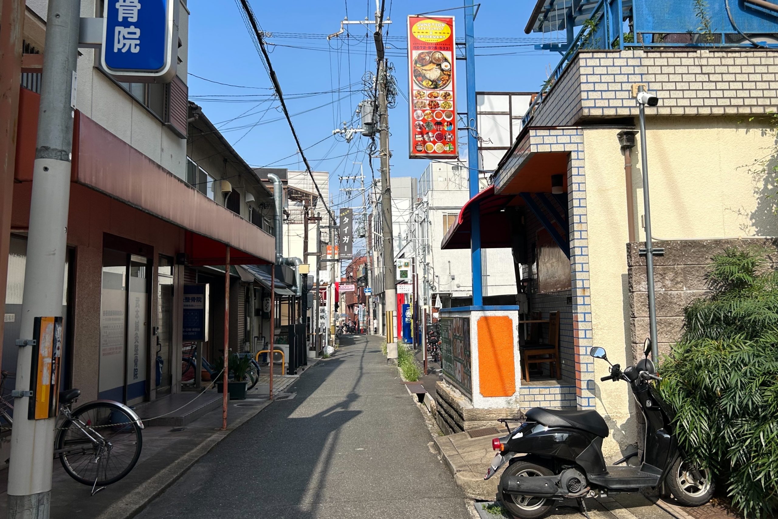 正解は、、、〒578-0941 大阪府東大阪市岩田町3-2付近から西に向かって撮影しました。このまま進むと若江岩田駅南側の商店街、「ローソン 東大阪岩田町三丁目店」の横に。背中側に行くと府道21号線(八尾枚方線)に出ます。