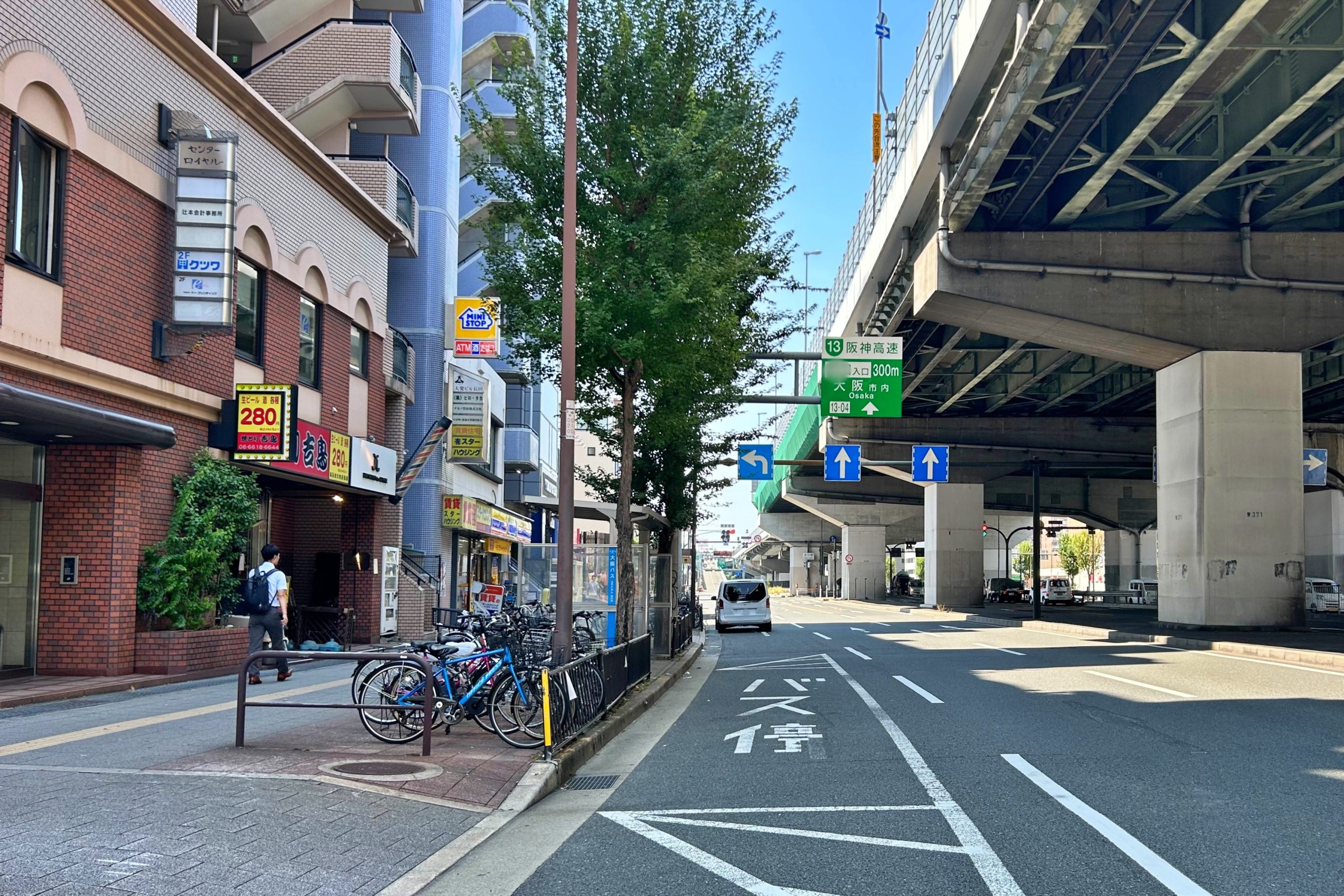 正解は、、、〒577-0012 大阪府東大阪市長田東1-2付近、国道308号(中央大通り)を西に向かって。長田駅4番出口や、大阪バスの停留所が見えています。バス停留所のある左折専用道路や、阪神高速の入口など情報量多めのやや難所。まあまあ失敗します。