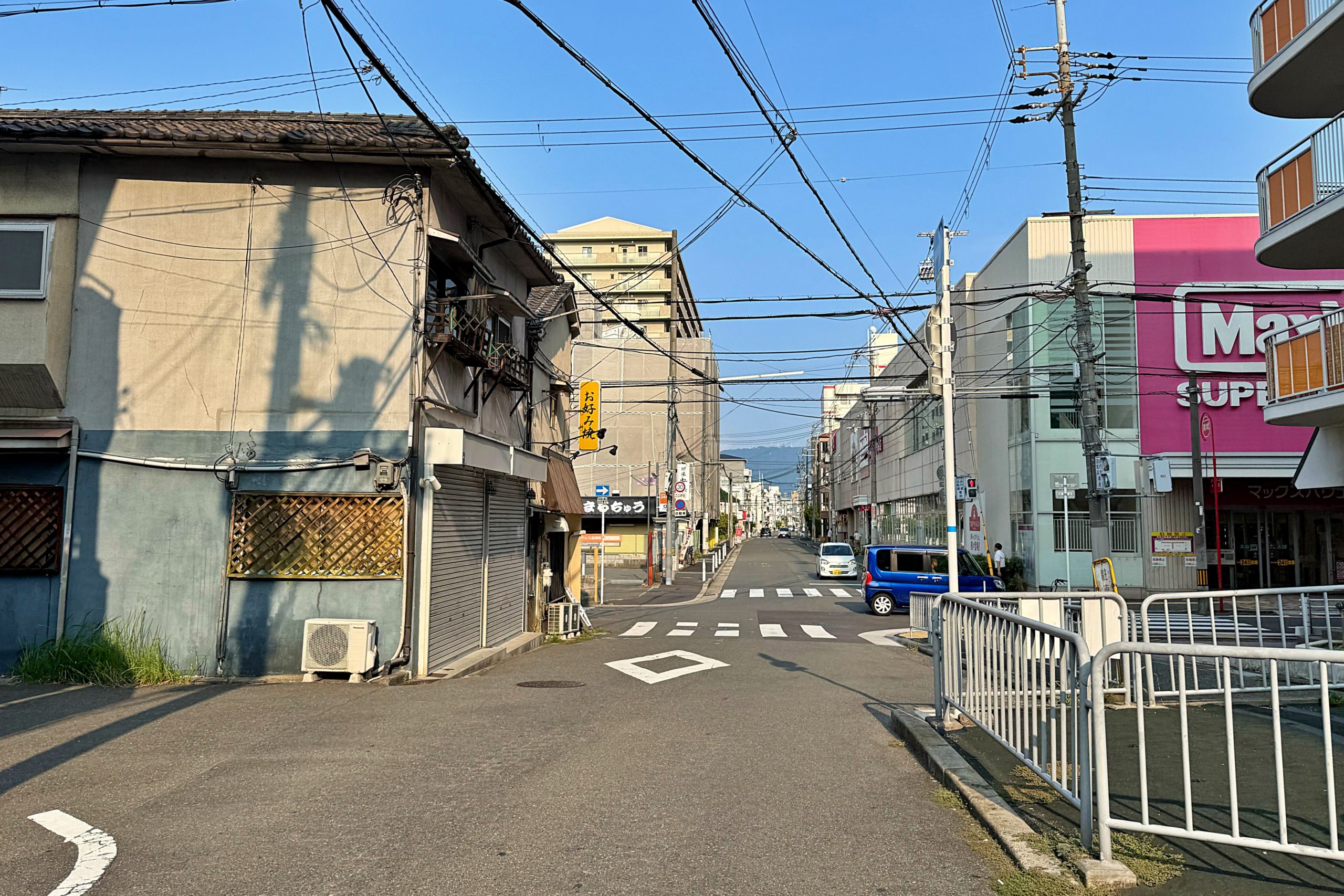 正解は、、、〒577-0036 大阪府東大阪市御厨栄町2-2付近から東に向かって撮影しました。右前方は「イオンタウン小阪店」で、南へ行くと河内小阪駅です。西向きの一方通行で、背中側に行くとメルシィ街に出ます。