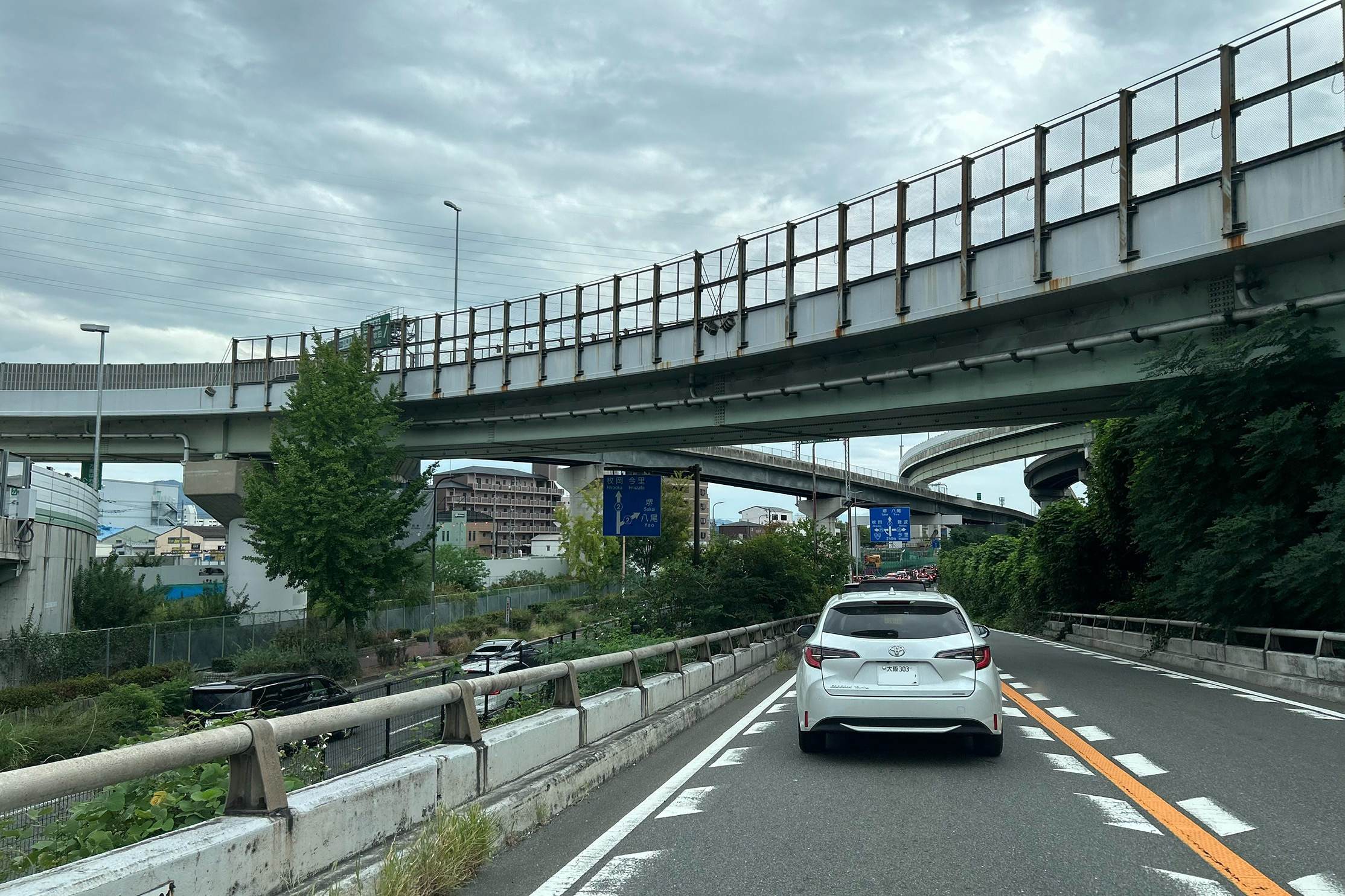 東大阪ジャンクションの真下。空を見上げれば高速道路が東西南北にうねりを描いています。ここから後方、北東には靴メーカー「コージ製靴」大阪営業所が。10/11〜靴とスーツのセール開始です。行ってみてね。