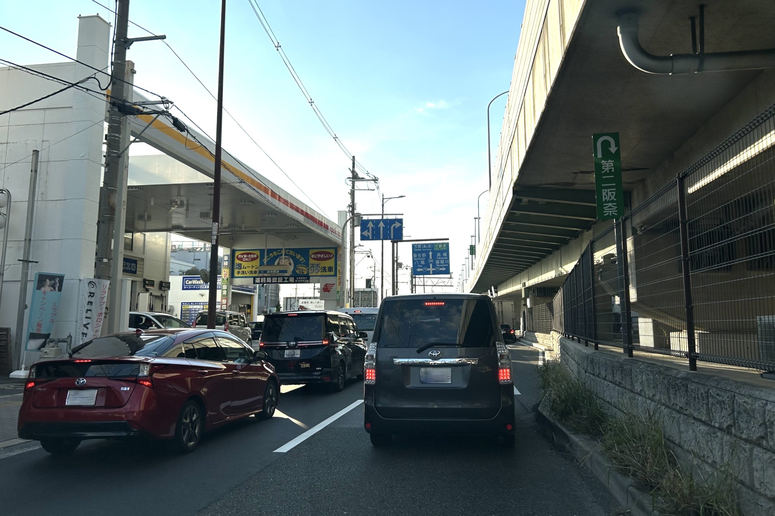 正解は、、、〒579-8013 大阪府東大阪市西石切町5-6付近。ガソリンスタンド「apollostation 石切 SS」を左手に西へ向かって撮影しました。真上の高架は阪神高速13号東大阪線。このまま進むと、国道170号線(大阪外環状線)と交わる被服団地前交差点です。