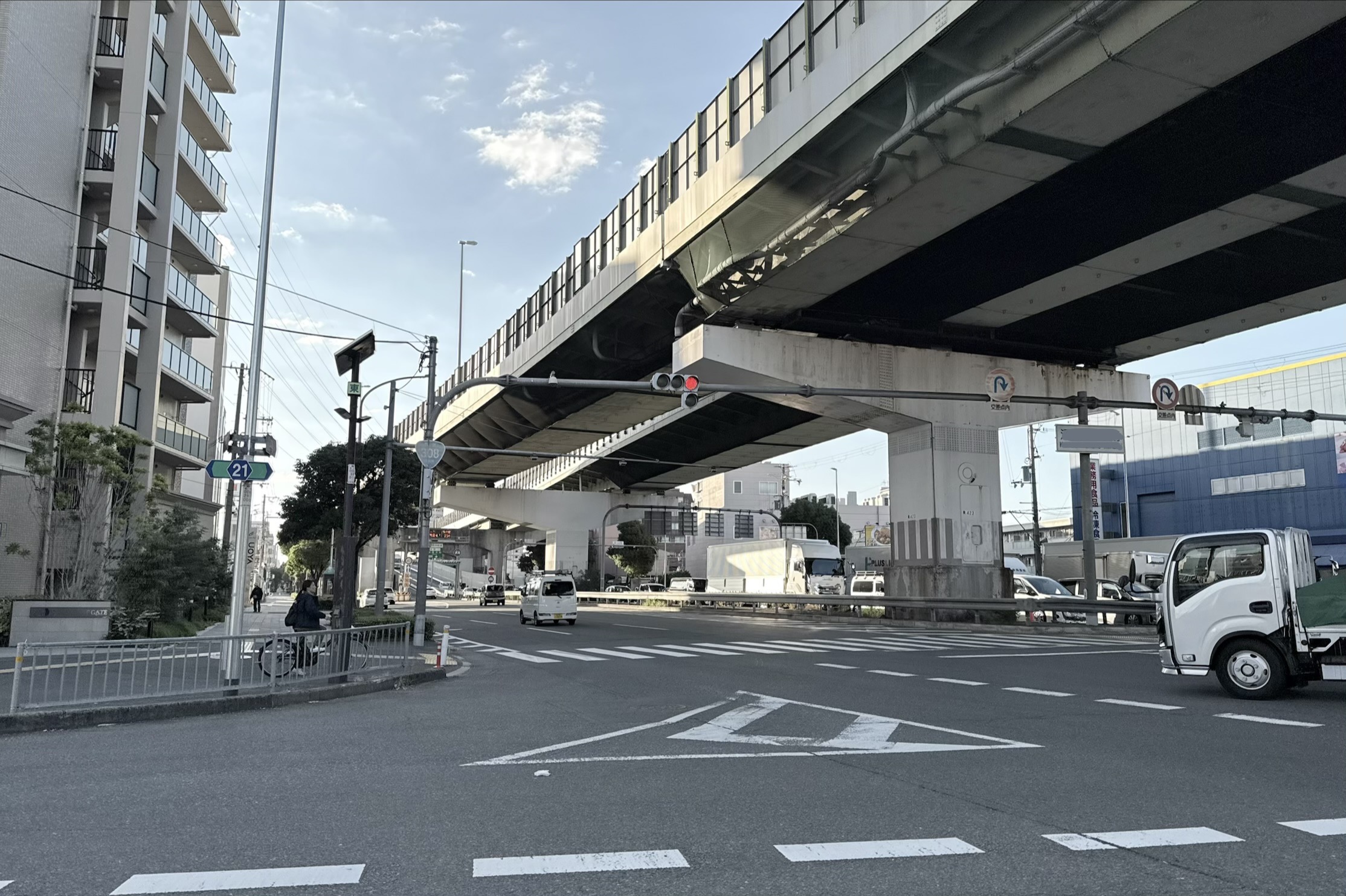 正解は、、、〒578-0985 大阪府東大阪市中野南2-39付近。府道21号線(八尾枚方線)と国道308号線(中央大通り)が交わる河内中野南交差点から西へ向かって撮影しました。真上の高架は阪神高速13号東大阪線で、前方に中野出入口が見えています。写真右手側で見切れている青色の建物は業務用卸売センター「C&Cエンド東大阪店」です。