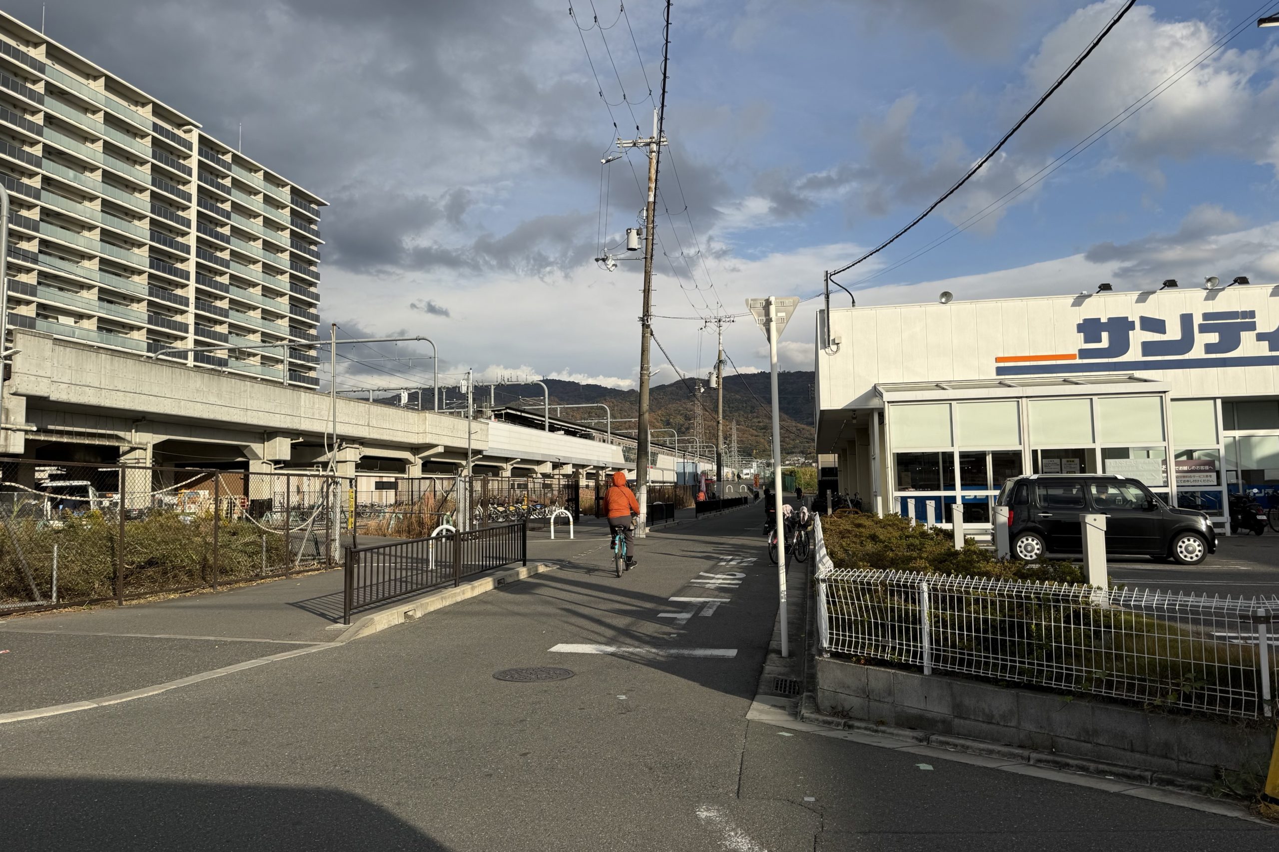正解は、、、〒578-0931 大阪府東大阪市花園東町2-3付近から東へ向かって撮影しました。右前方は「サンディ東花園店」です。左手の高架は近鉄奈良線で、左前方に東花園駅が見えています。