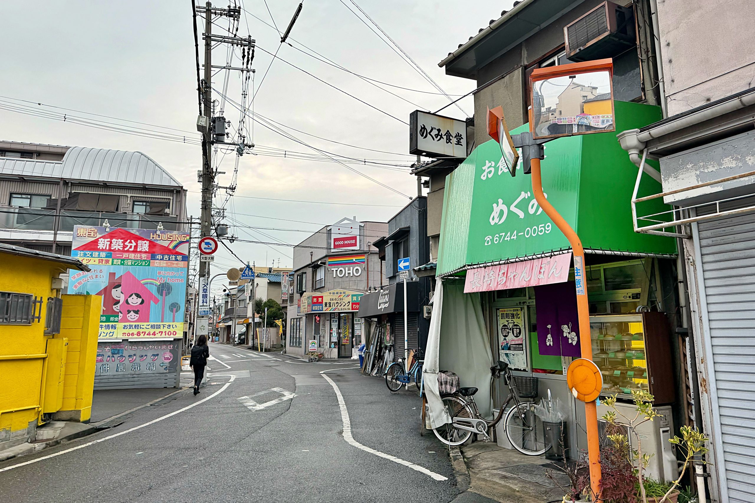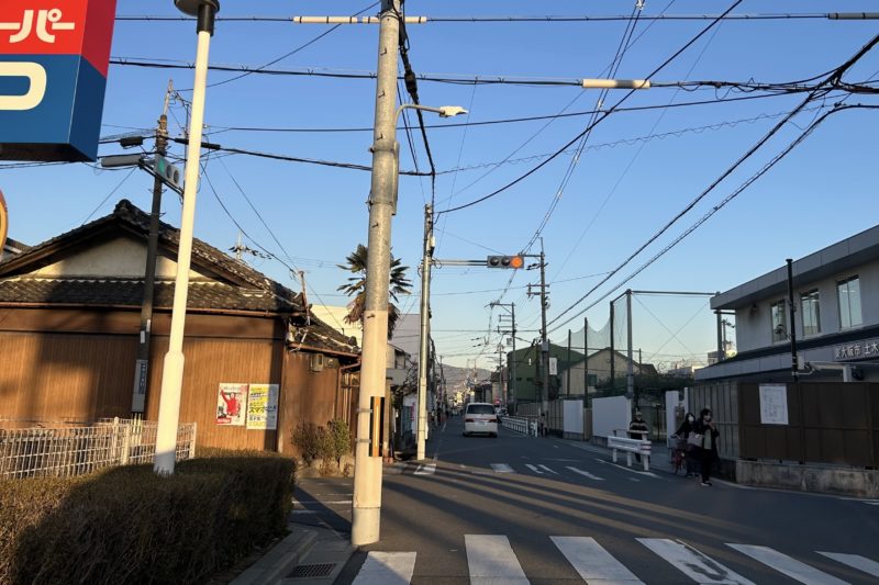 正解は、、、〒577-0004 大阪府東大阪市稲田新町1-6付近、府道15号線(八尾茨木線)から北西へ向かって撮影しました。このまましばらく直進し学研都市線の踏切を北へ行くと徳庵駅です。南に300mほど行くと「とんかつ ひろ喜 徳庵本店」があります。