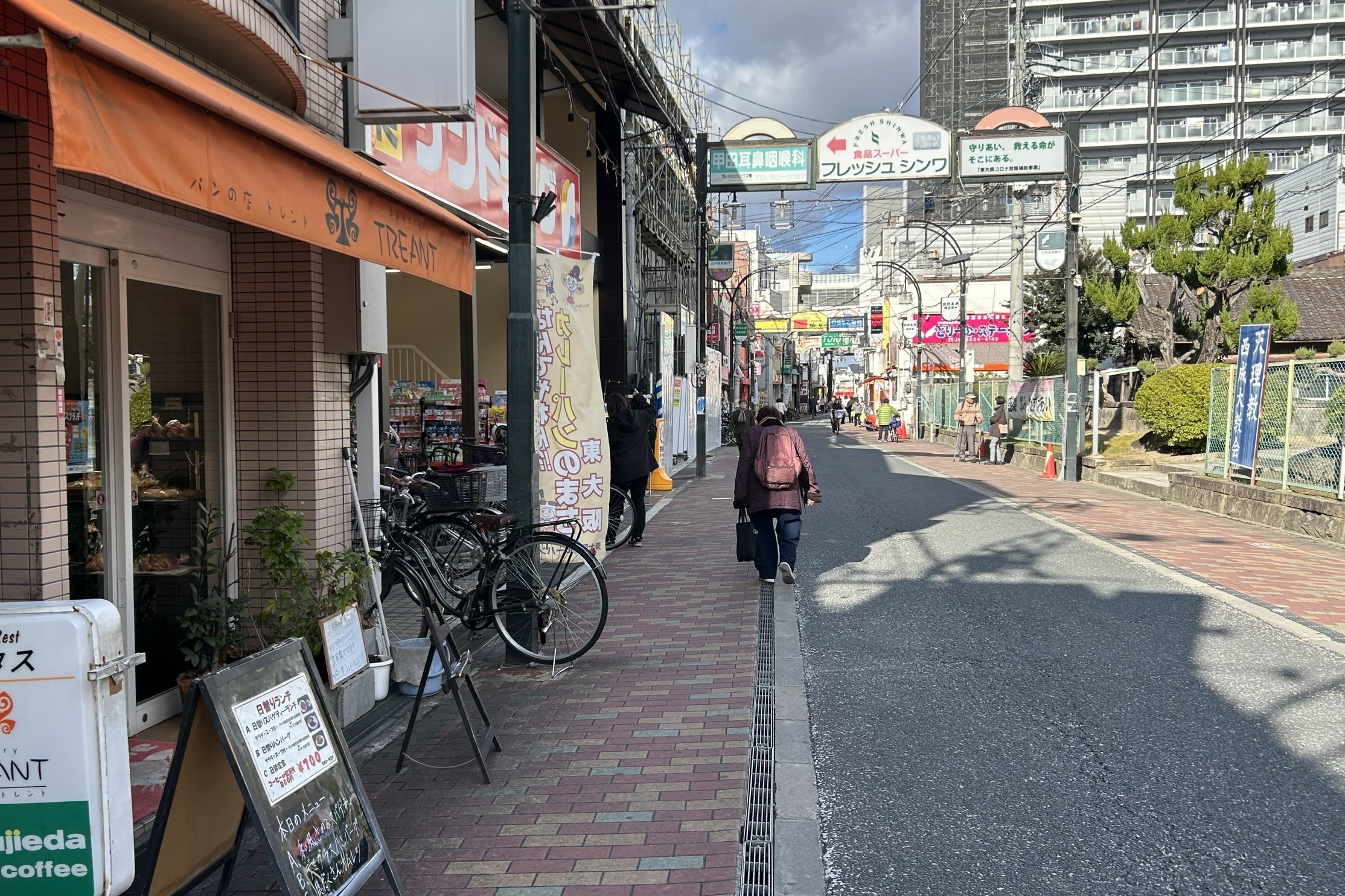 正解は、、、〒578-0941 大阪府東大阪市岩田町3-10付近。岩田本通商店街の「ベーカリー トレント」を左手に見て、北へ向かって撮影しました。右手側には「天理教 西成 大教会」が。南行きの一方通行で、このまま200mほど行くと若江岩田駅です。