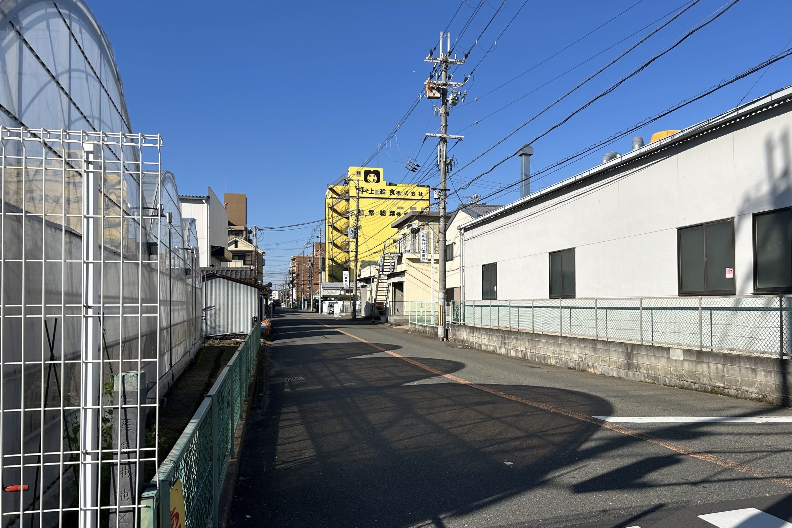 正解は、、、〒577-0063 大阪府東大阪市川俣1-18付近から西へ向かって撮影しました。正面に見える黄色い建物は「村上給食株式会社」の川俣工場。同社は現在、閉業しています。このまま道なりに進むと川俣公園が左手に。背中側に200mほど行くと第二寝屋川に架かる川俣大橋です。