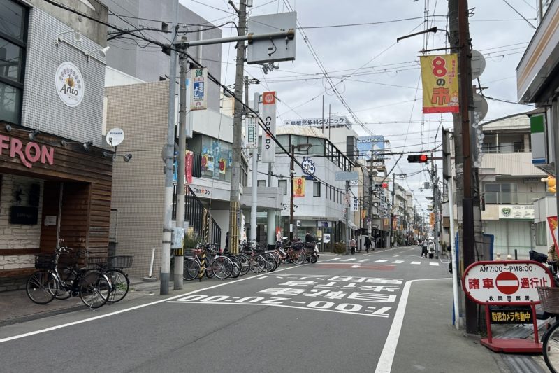 正解は、、、〒579-8046 大阪府東大阪市昭和町1−3付近。国道として有名な瓢箪山商店街の北、アーケードの途切れた「喜里川東交差点」を南から撮影しました。