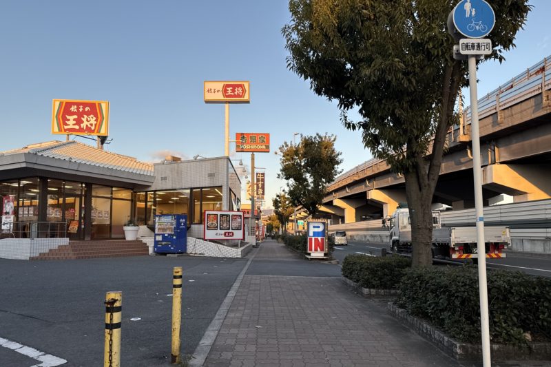 正解は、、、〒577-0824 大阪府東大阪市大蓮東5-15付近。府道2号線(大阪中央環状線)沿いを北東に向かって撮影しました。左前方は「餃子の王将 久宝寺店」です。久宝寺店ですが、住所は東大阪。後方に50mほど行くと八尾です。