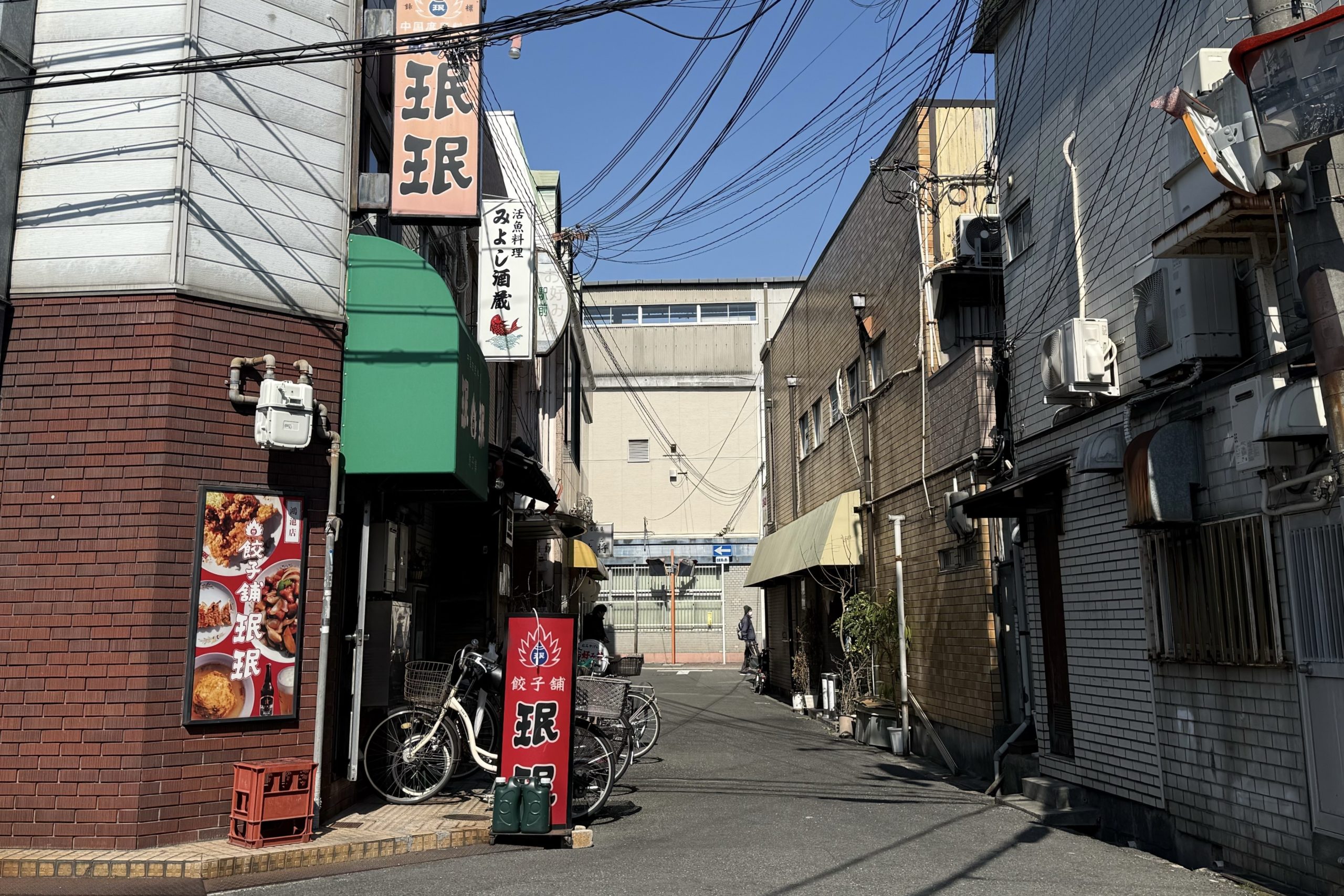 正解は、、、〒578-0976 大阪府東大阪市西鴻池町2-1付近、JR鴻池新田駅の南「珉珉 鴻池新田店」を左に見て駅に向かって撮影しました。飲食店が密集する、鴻池新田のホットスポットです。特に珉珉は東大阪で現存する最古の店舗。みんなで保存しましょう。