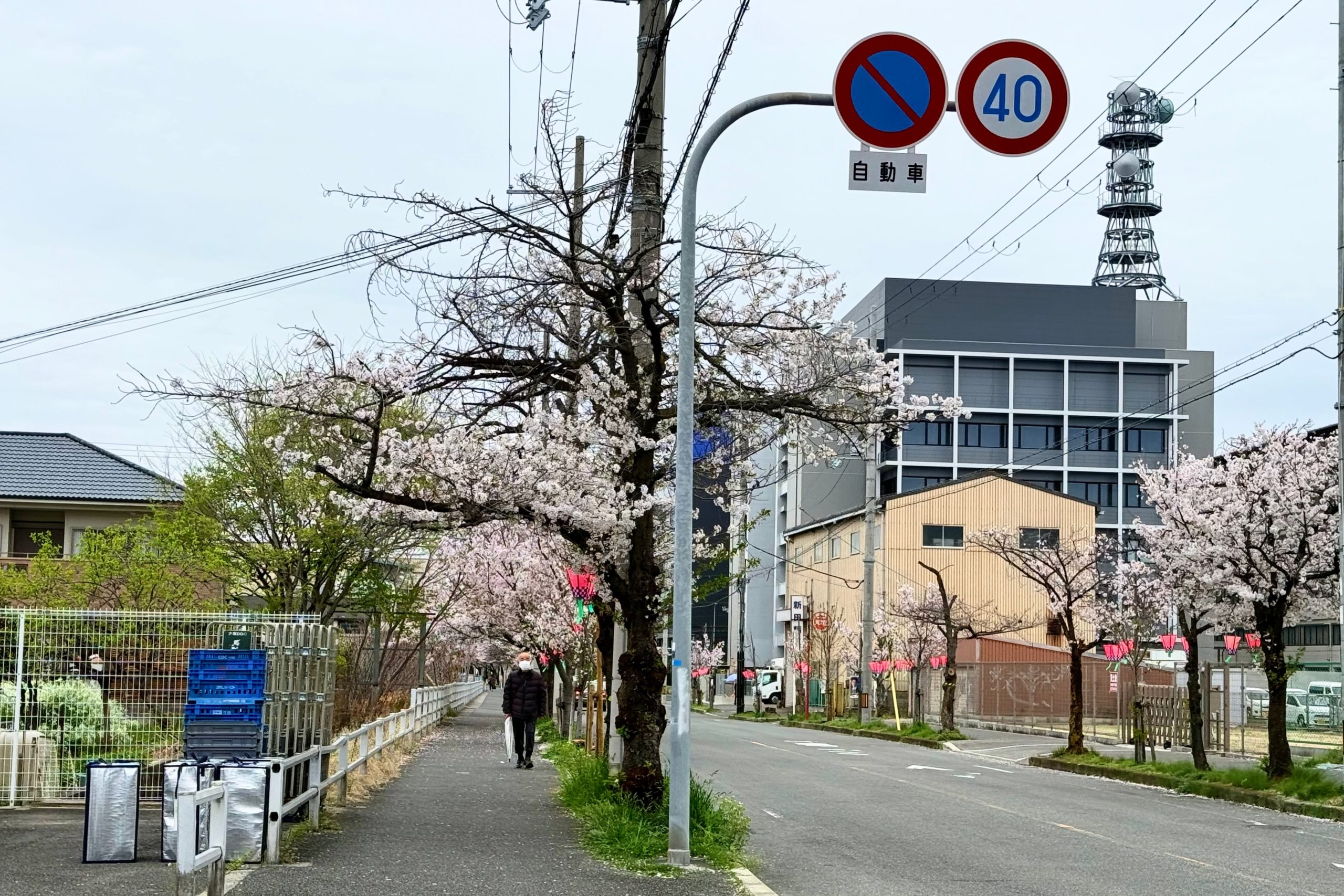 正解は、、、〒578-0925 大阪府東大阪市稲葉2-1付近。「ローソン 東大阪花園桜通り店」前から北に向かって撮影しました。