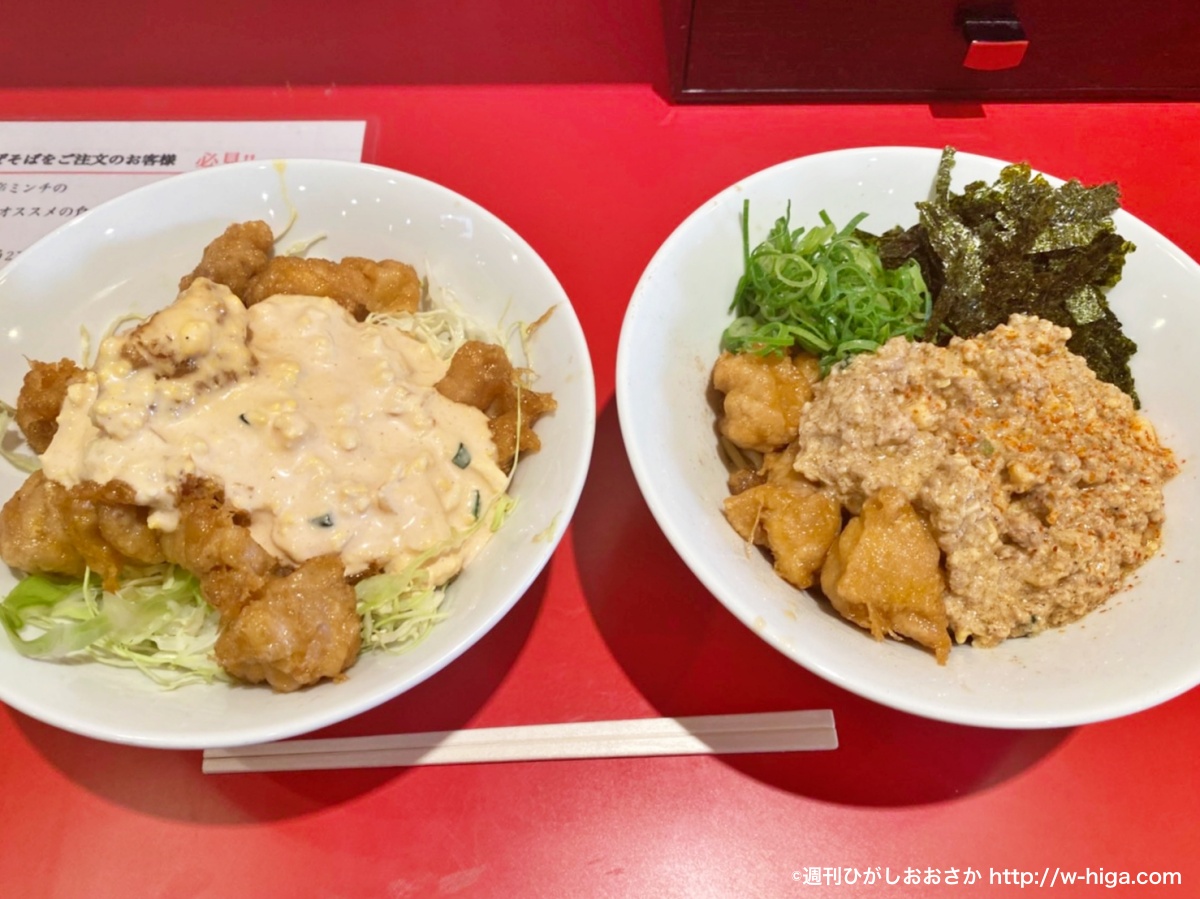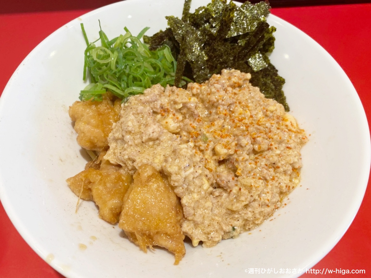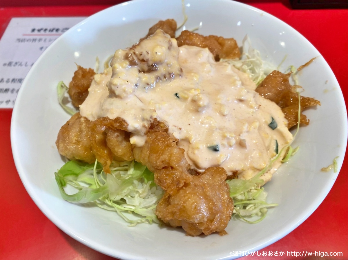 「チキン南蛮まぜそば」(並/700円)という名前の通りチキン南蛮がまぜそばの上に乗っかった、量と個性の応酬!!