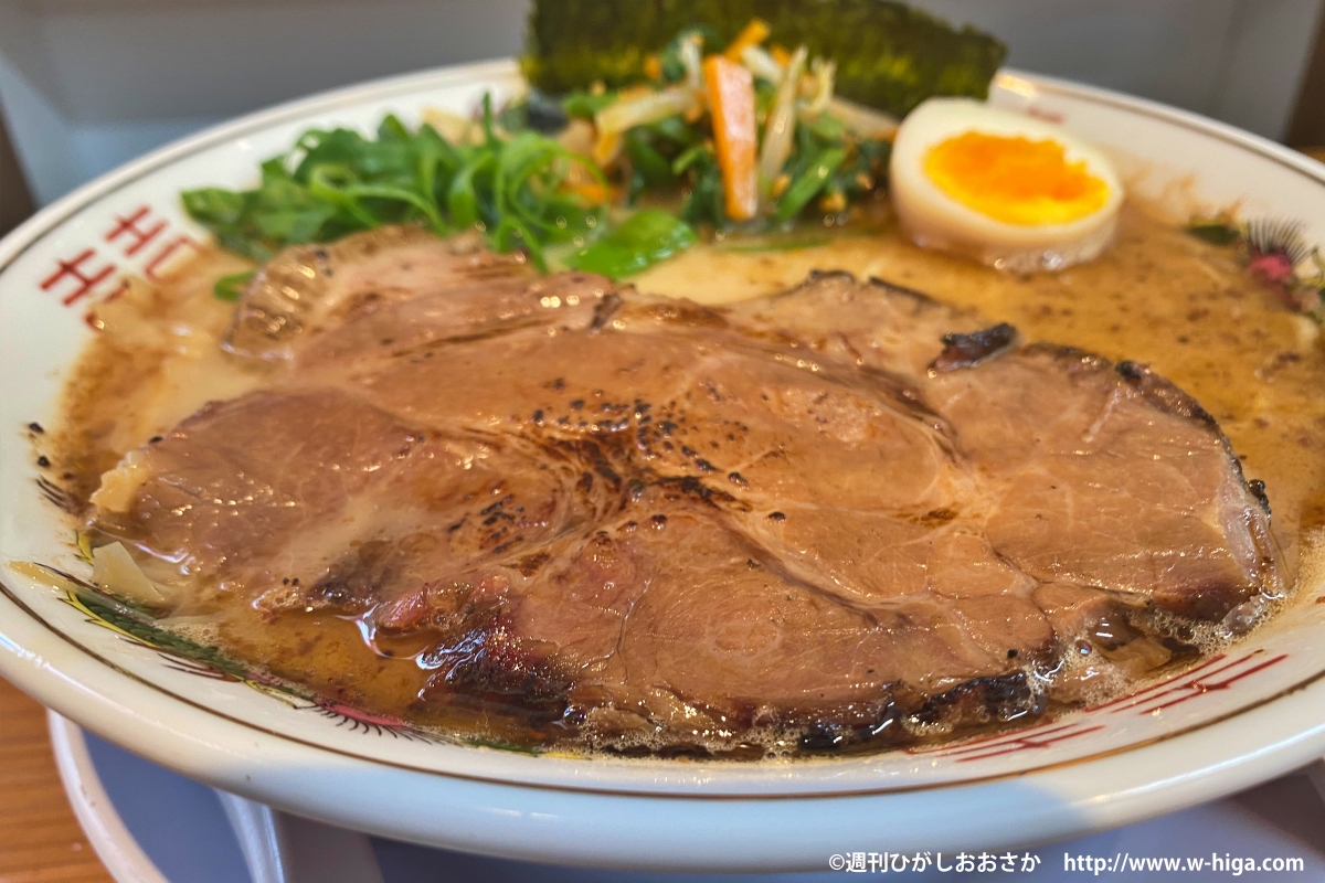 白濁した豚骨スープに、炙られた大きなチャーシューが存在感を出しています。ニンニクマー油が食欲をさらにかき立て、スープをぺろりと飲み干しました。