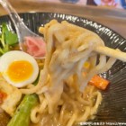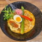 「幕の内弁当のようなおかずの楽しさをイメージしました」と、鶏モモの天ぷらにパプリカ、アスパラ、ゆで卵、豆苗、甘酢生姜と色とりどりのトッピング。麺を主食にオカズを食べる、シュリケンにしかない一杯です。