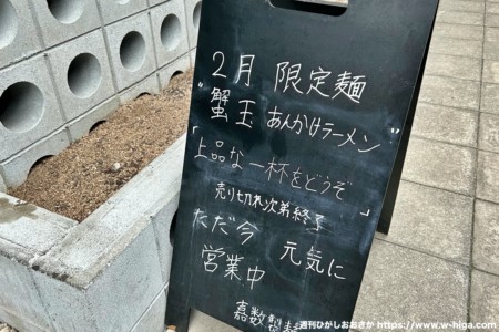 2週連続失礼します。月初には必ず行きたいラーメン店Part1「嘉数製麺所」。花園は和横丁にある同店は、毎月趣向を凝らした限定を提供します。2月は「蟹玉あんかけラーメン」。