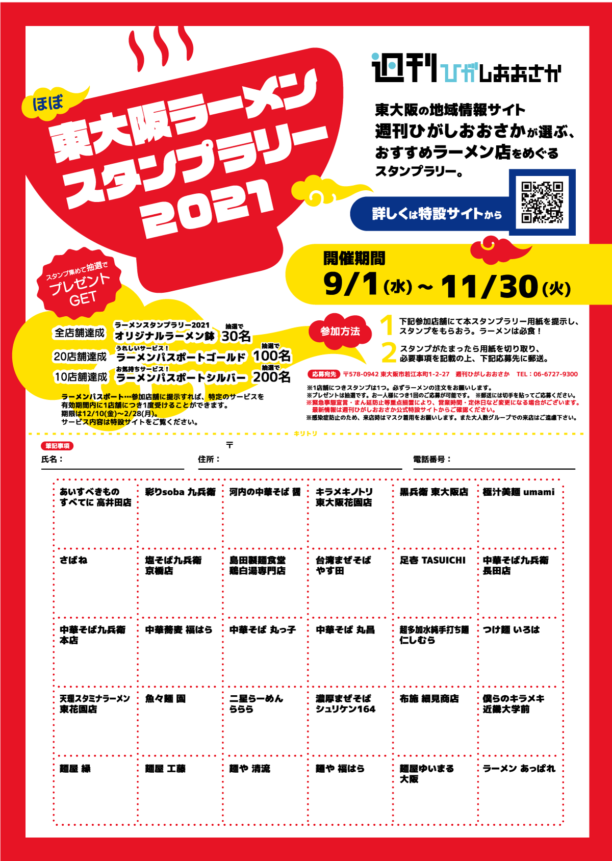 東大阪の地域情報サイト週刊ひがしおおさかが選ぶ、おすすめラーメン店をめぐるスタンプラリー。