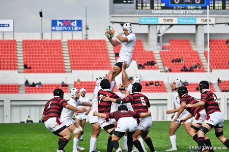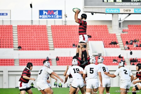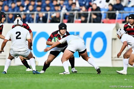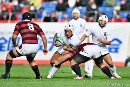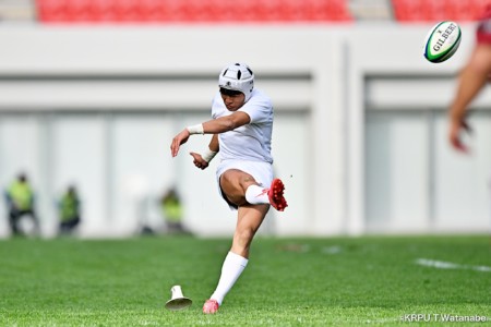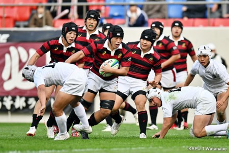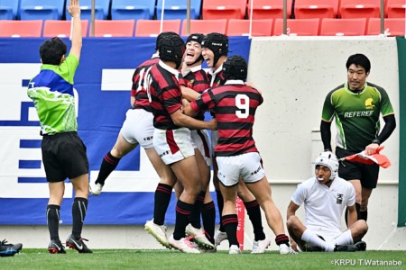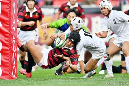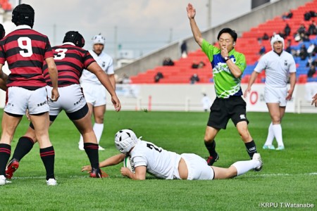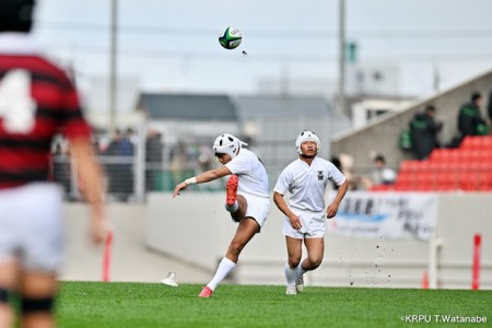 後半に入ると、早稲田実業の動きが良くなる。2分に、右ゴール前ラックから短いパスを次々につなげて左端で1人あまる見事なパス回し。最後は11大内 颯真がグラウンディングし、ゴールも成功。14-7と1トライ1ゴール差にする。
