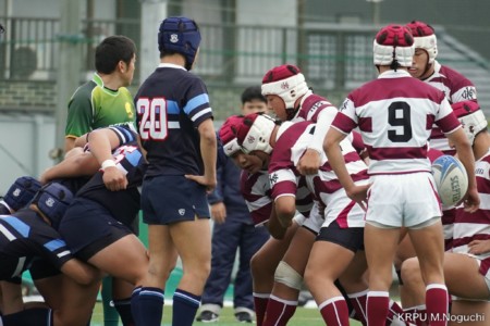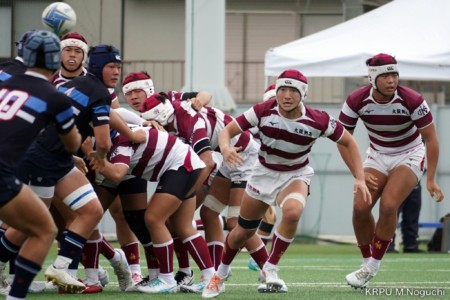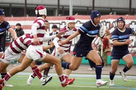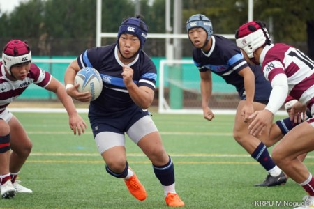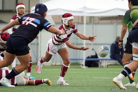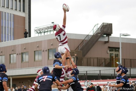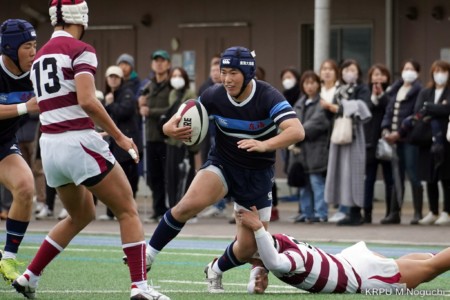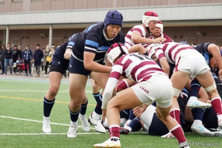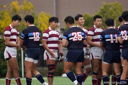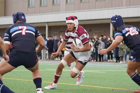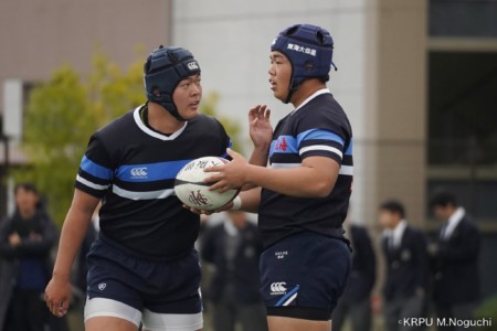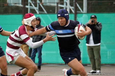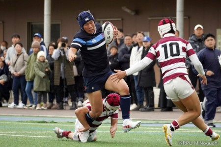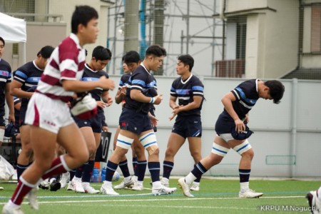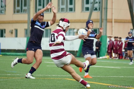 後半、東海大仰星は相手ボールスクラムで勝り、ボールを奪ってトライ。マイボールラインアウトでオーバーしても、素早く反応したBKが補いトライまで持っていく。