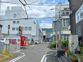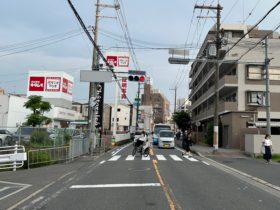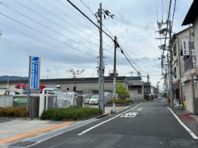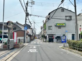 正解は、、、〒579-8046 大阪府東大阪市昭和町4-7付近、近鉄瓢箪山駅北側「力餅瓢箪山店」の前から東に向かって撮影しました。